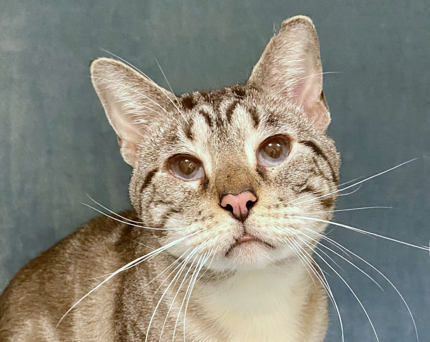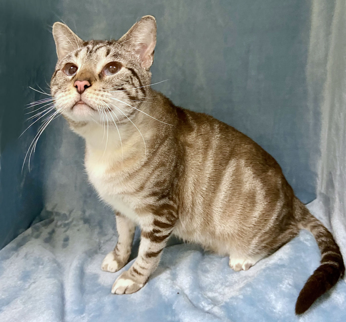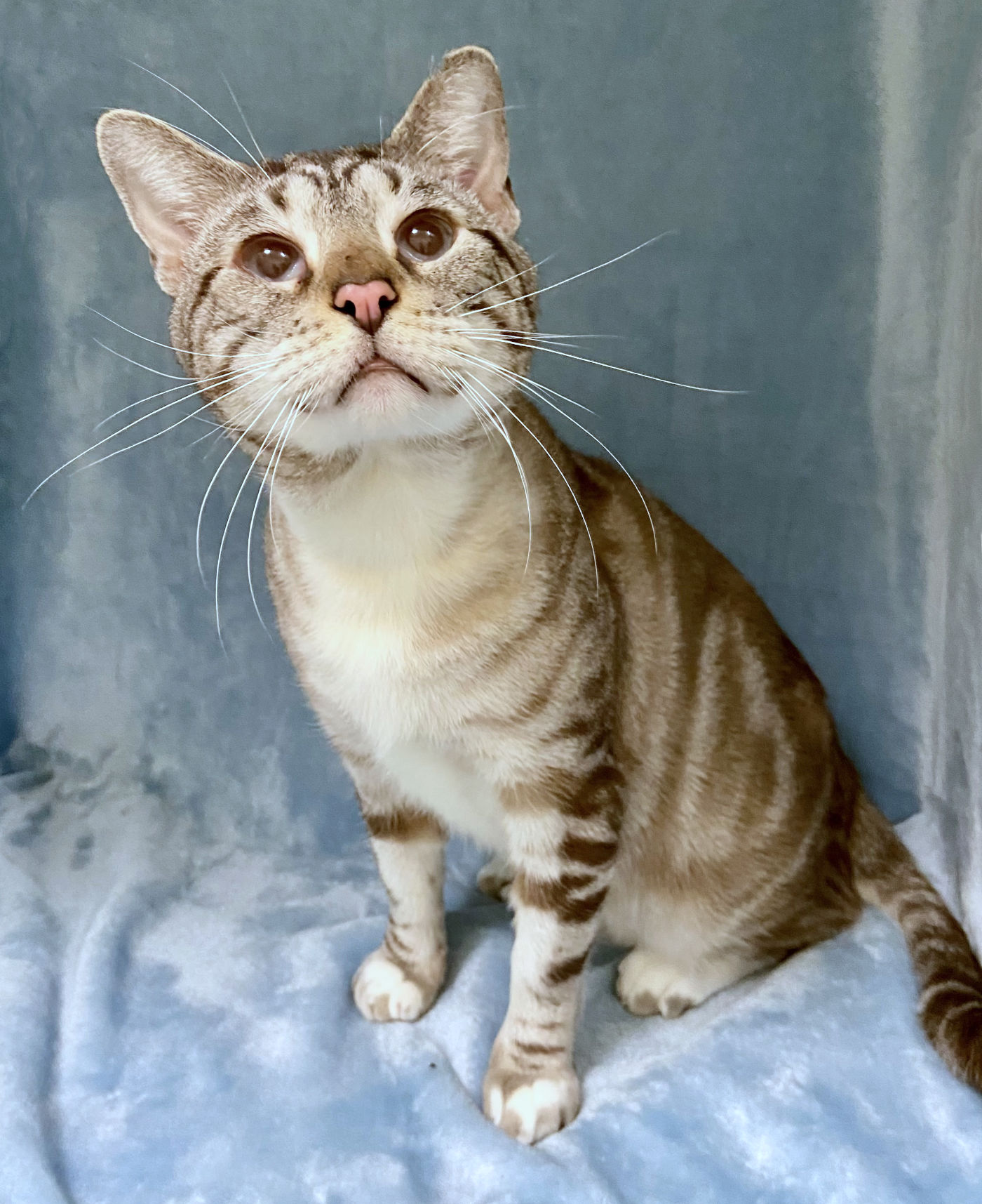 Hi world, I’m Aiko! I’m a striking lynx point fellow with warm tabby stripes and sea blue eyes that tell you of my Siamese heritage. I came here from a sister rescue where I was found trying to survive outside. I love being an indoor cat and am ready for my own family now!