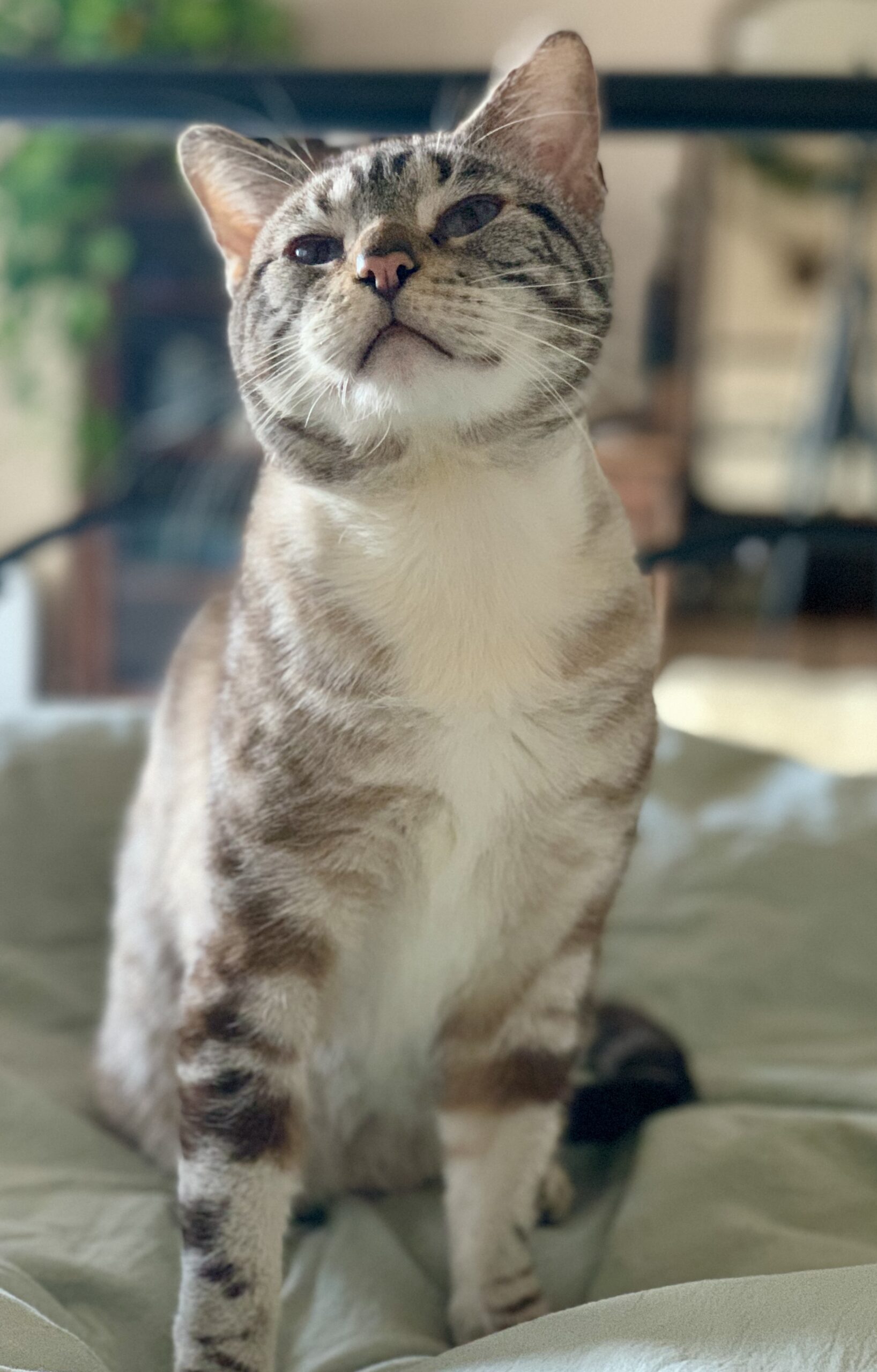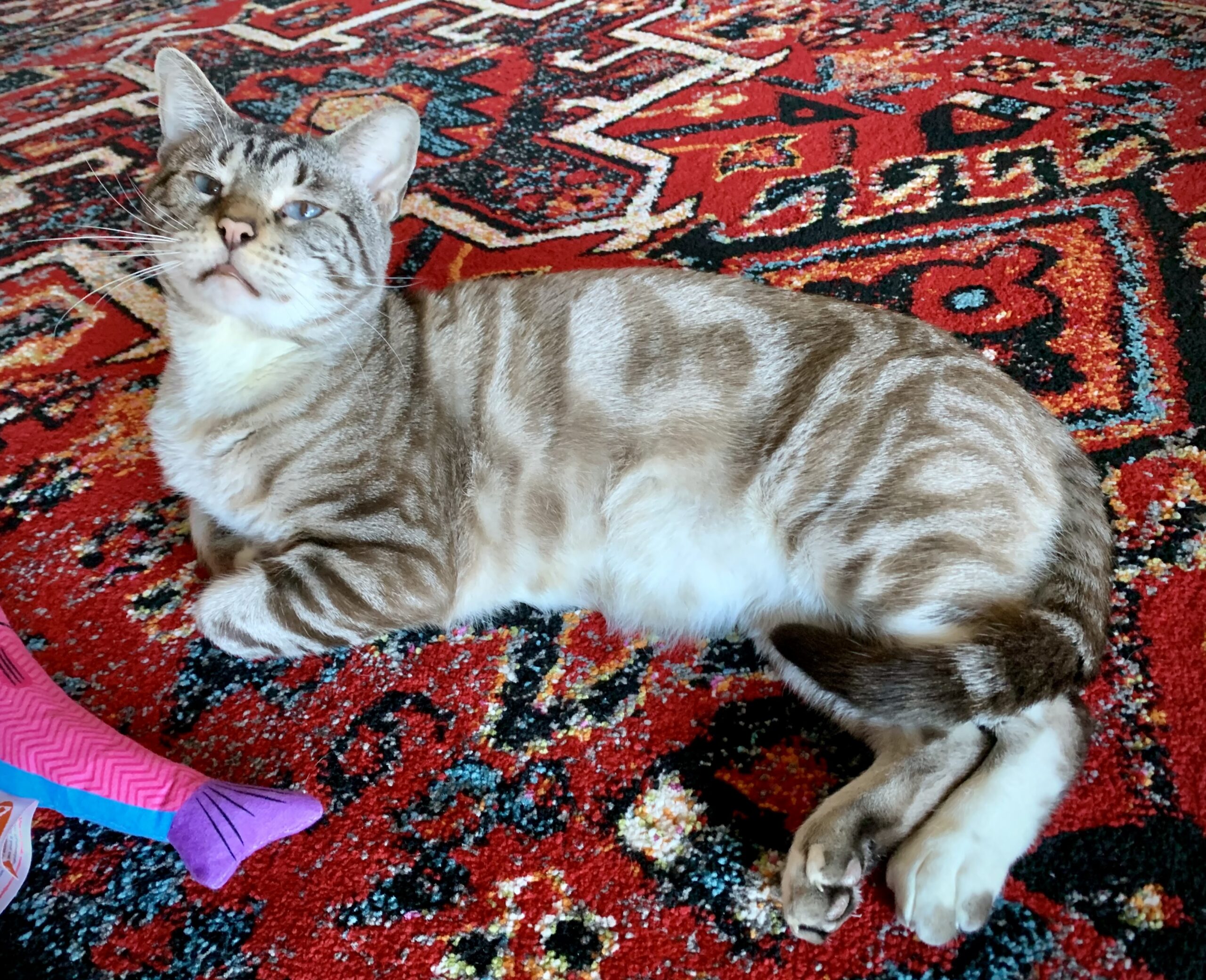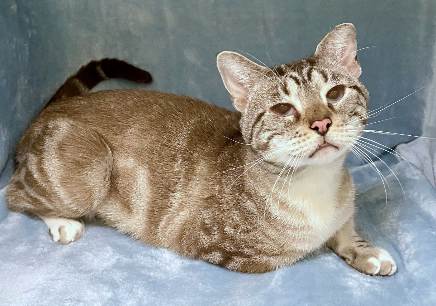 Hi world, I’m Aiko! I’m a striking lynx point fellow with warm tabby stripes and sea blue eyes that tell you of my Siamese heritage. I came here from a sister rescue where I was found trying to survive outside. I love being an indoor cat and am ready for my own family now!