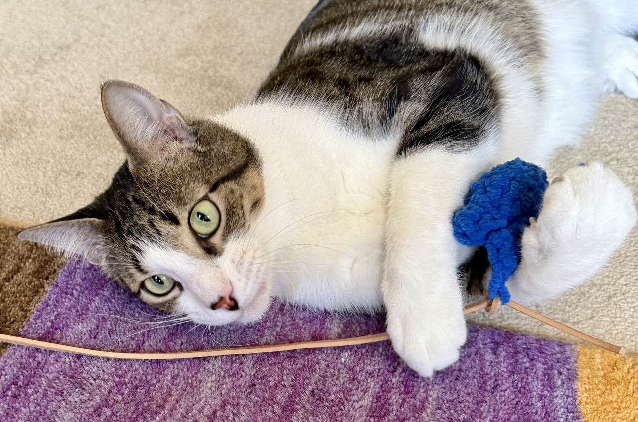 I’m no couch potatoes though, as play is definitely my love language! I like most all kitty wand toys, but especially the Slither Snake wand, which will come home with me. I love pouncing and chasing it up and down a room, and will even play all over with the Red Dot too, content to finish with a small protein treat.