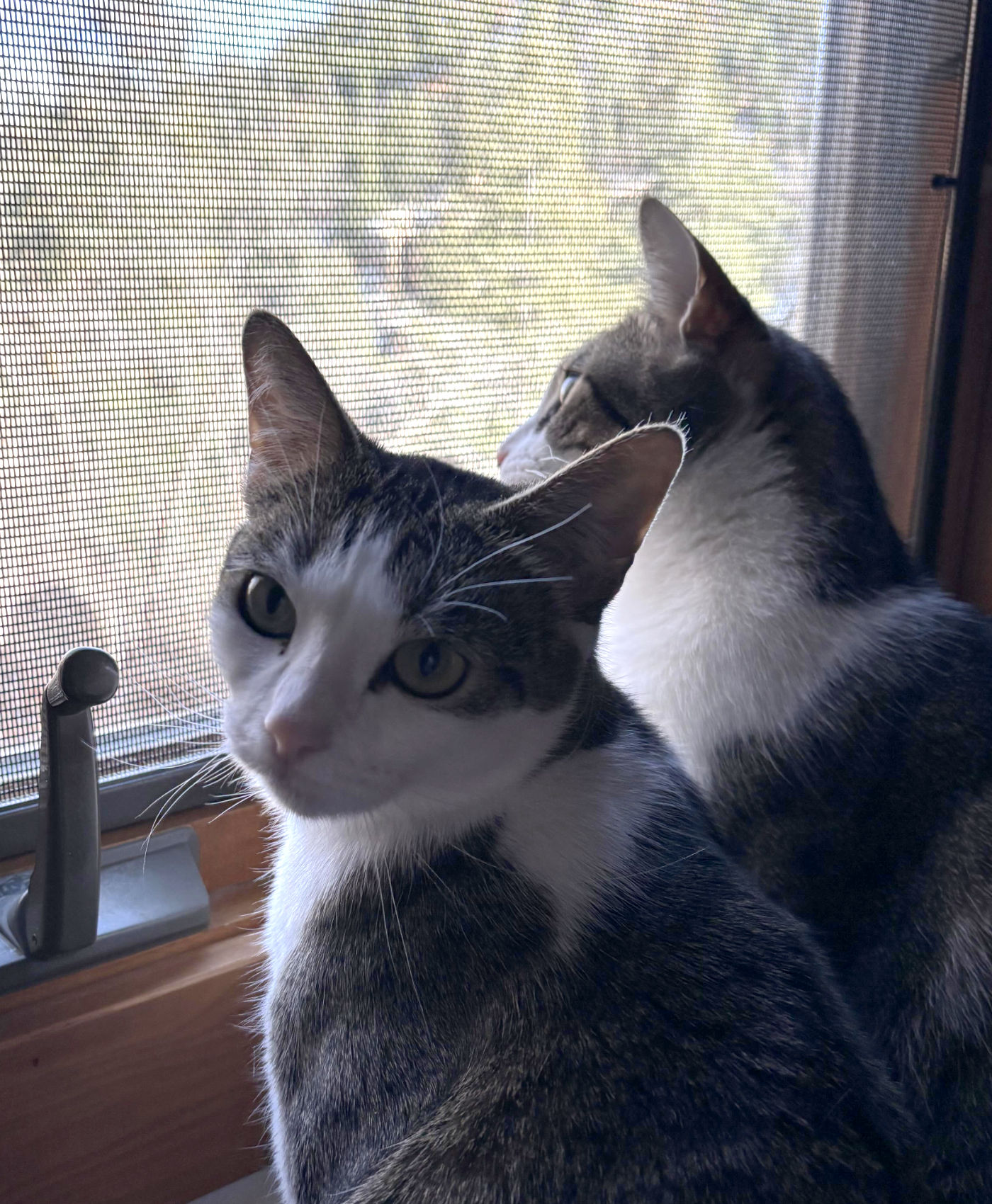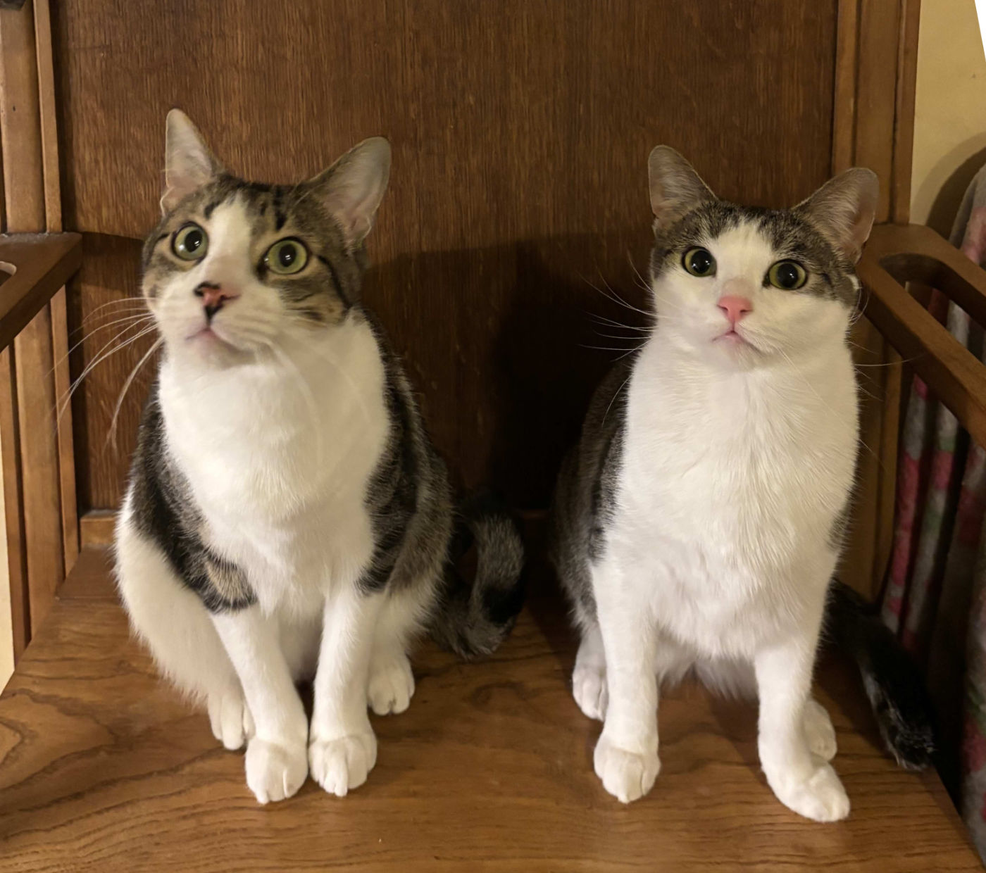 They’re both handsome patched tabbies with neat white masks, ascots and boots. Clark is slightly bigger with a freckled nose and Petite’s is pink. With their big sage green eyes, they make a beautiful pair of cats, balanced yin and yang.