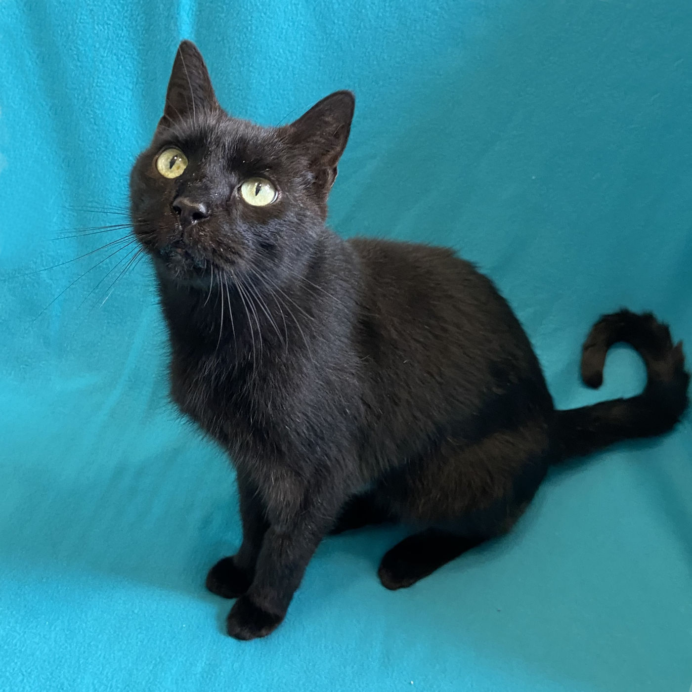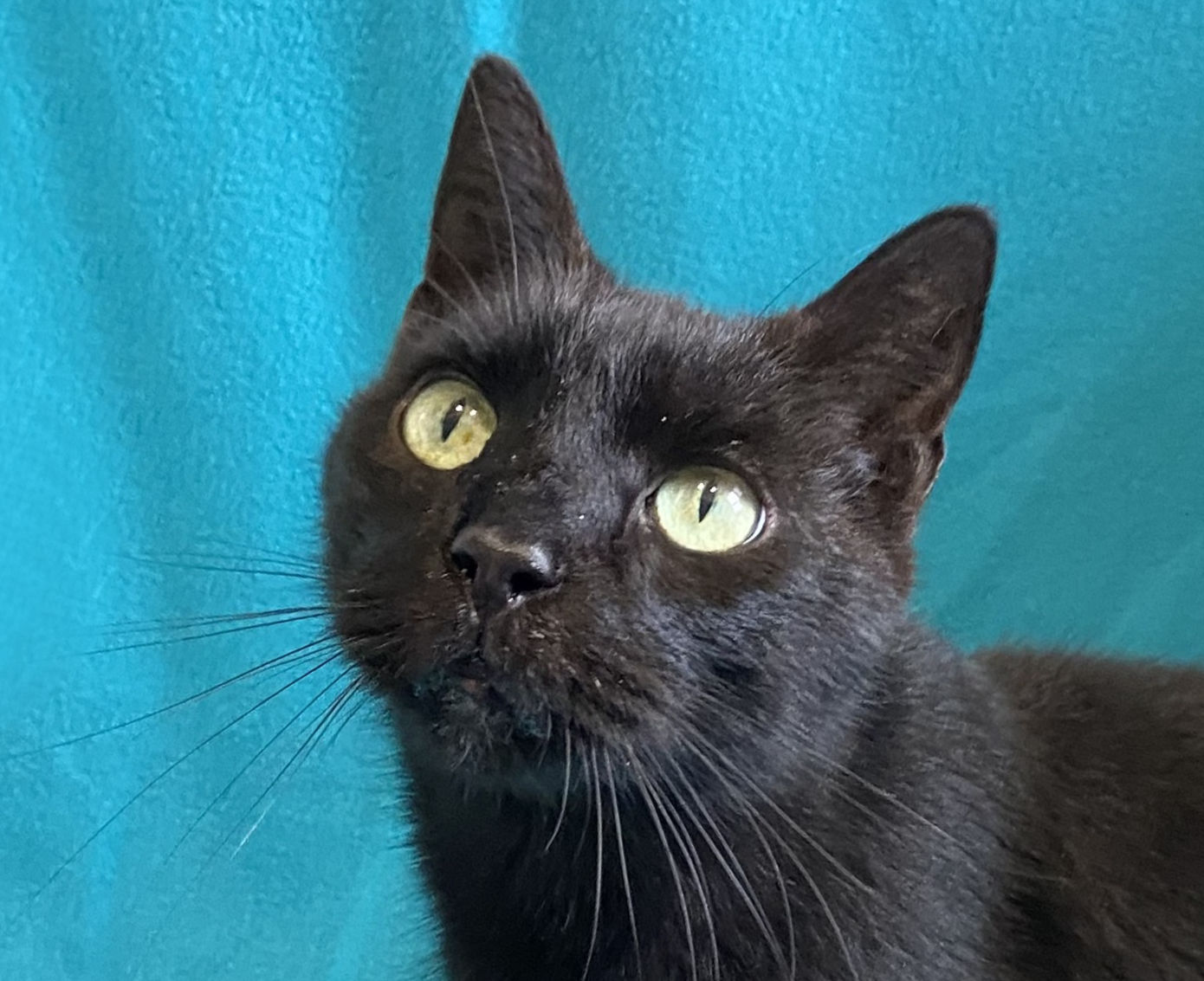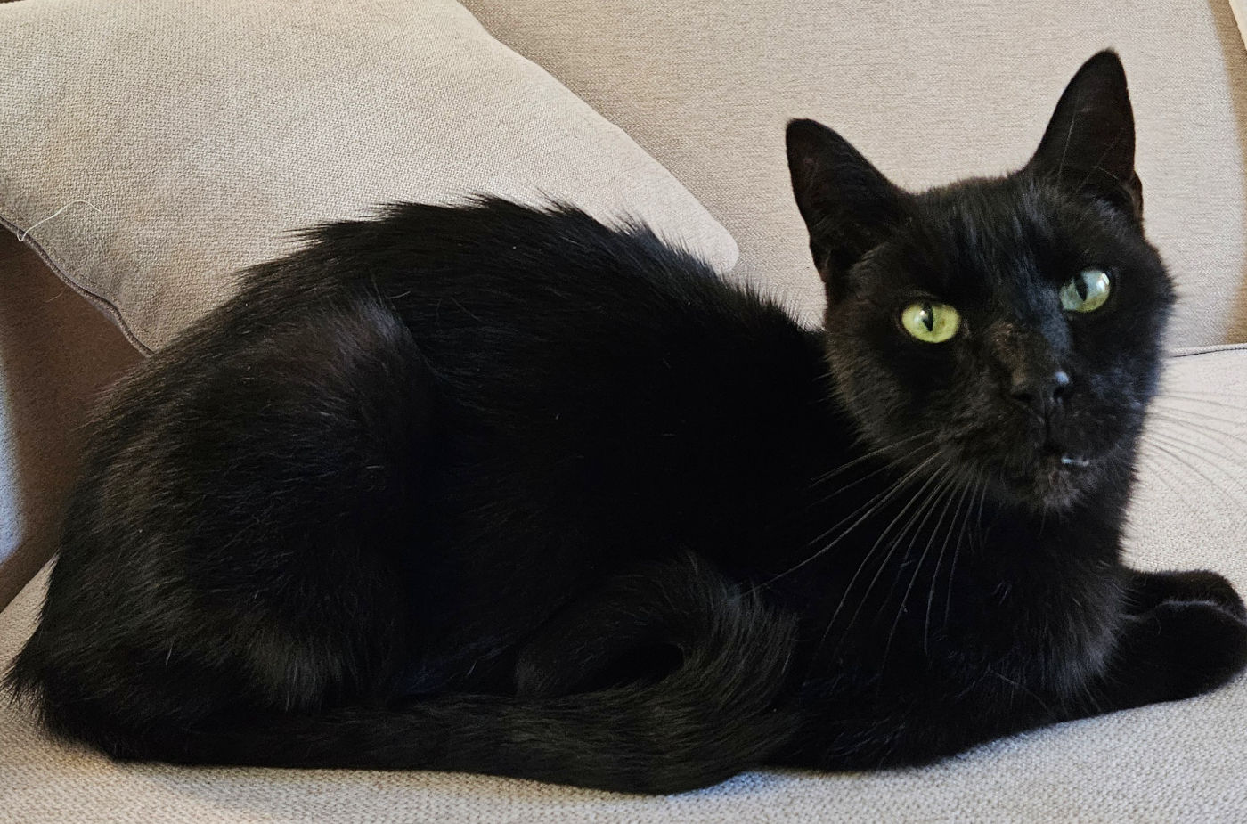 I’m a sleek, black short-haired gentleman with a long, graceful body and a cool cat personality. My story started rough: as a tiny kitten, I was thrown out of a moving car on a Texas highway. My person saw it happen, stopped traffic, and scooped me up before I was hit.