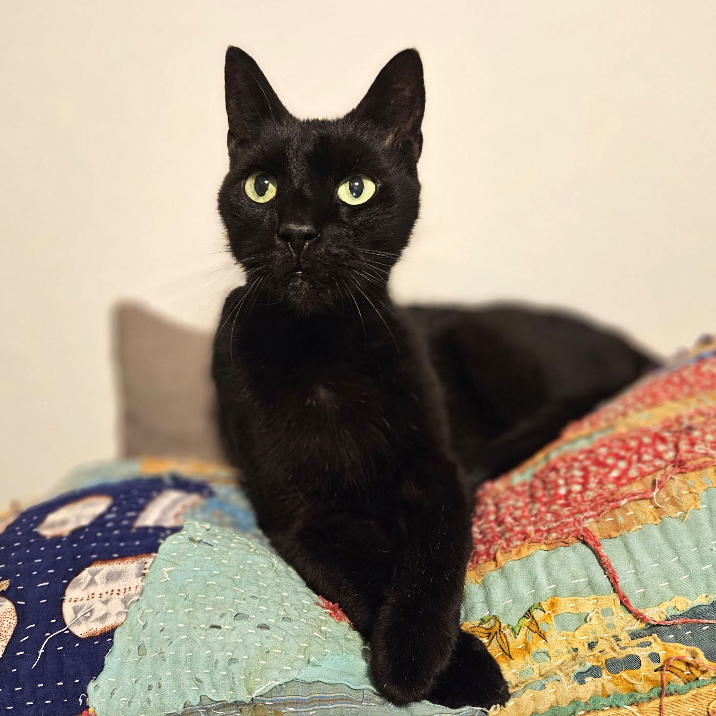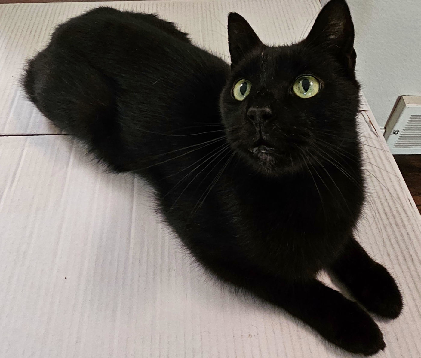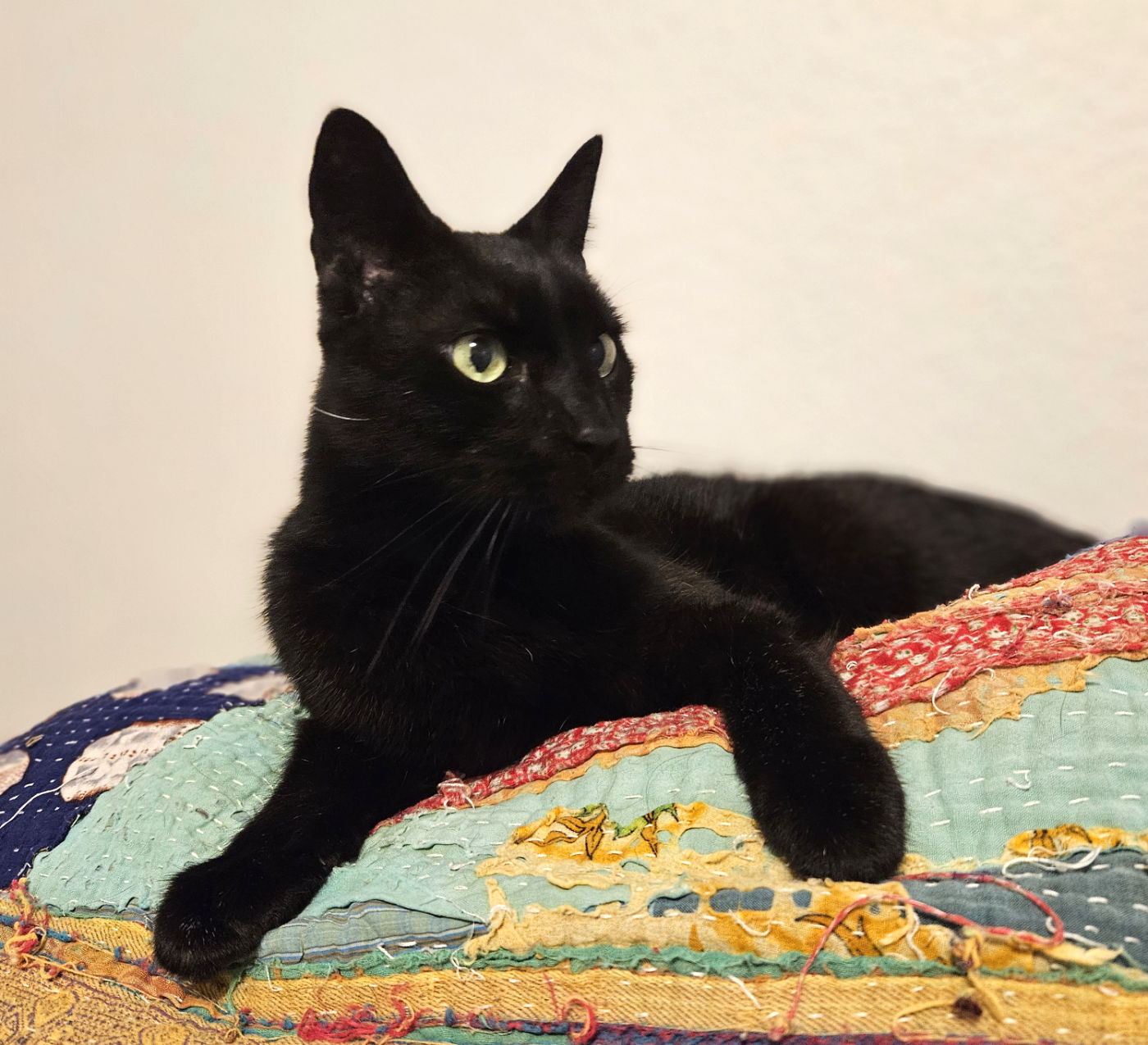 I’m a sleek, black short-haired gentleman with a long, graceful body and a cool cat personality. My story started rough: as a tiny kitten, I was thrown out of a moving car on a Texas highway. My person saw it happen, stopped traffic, and scooped me up before I was hit.