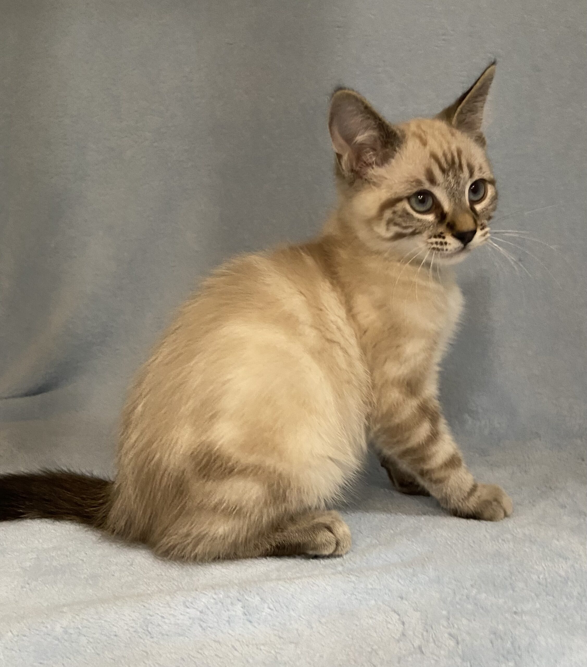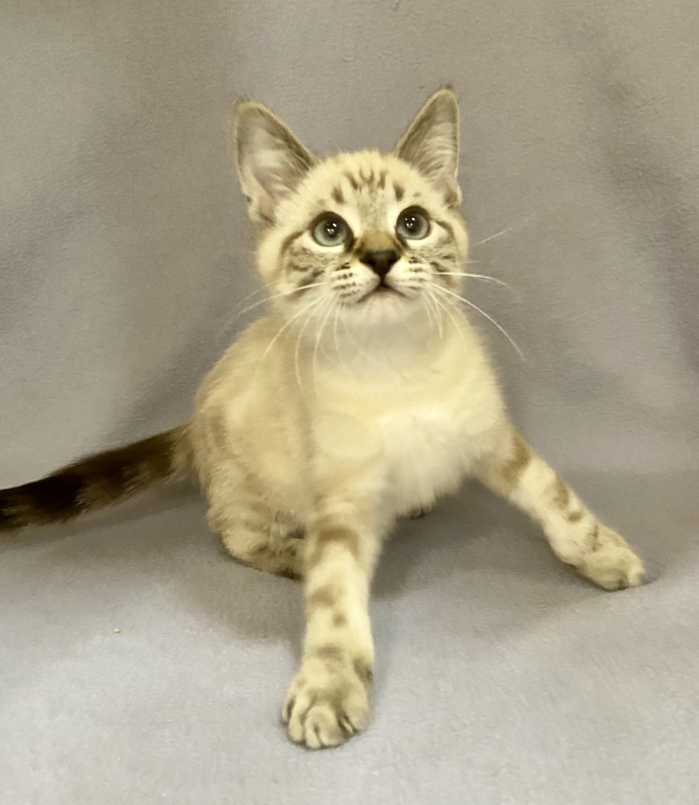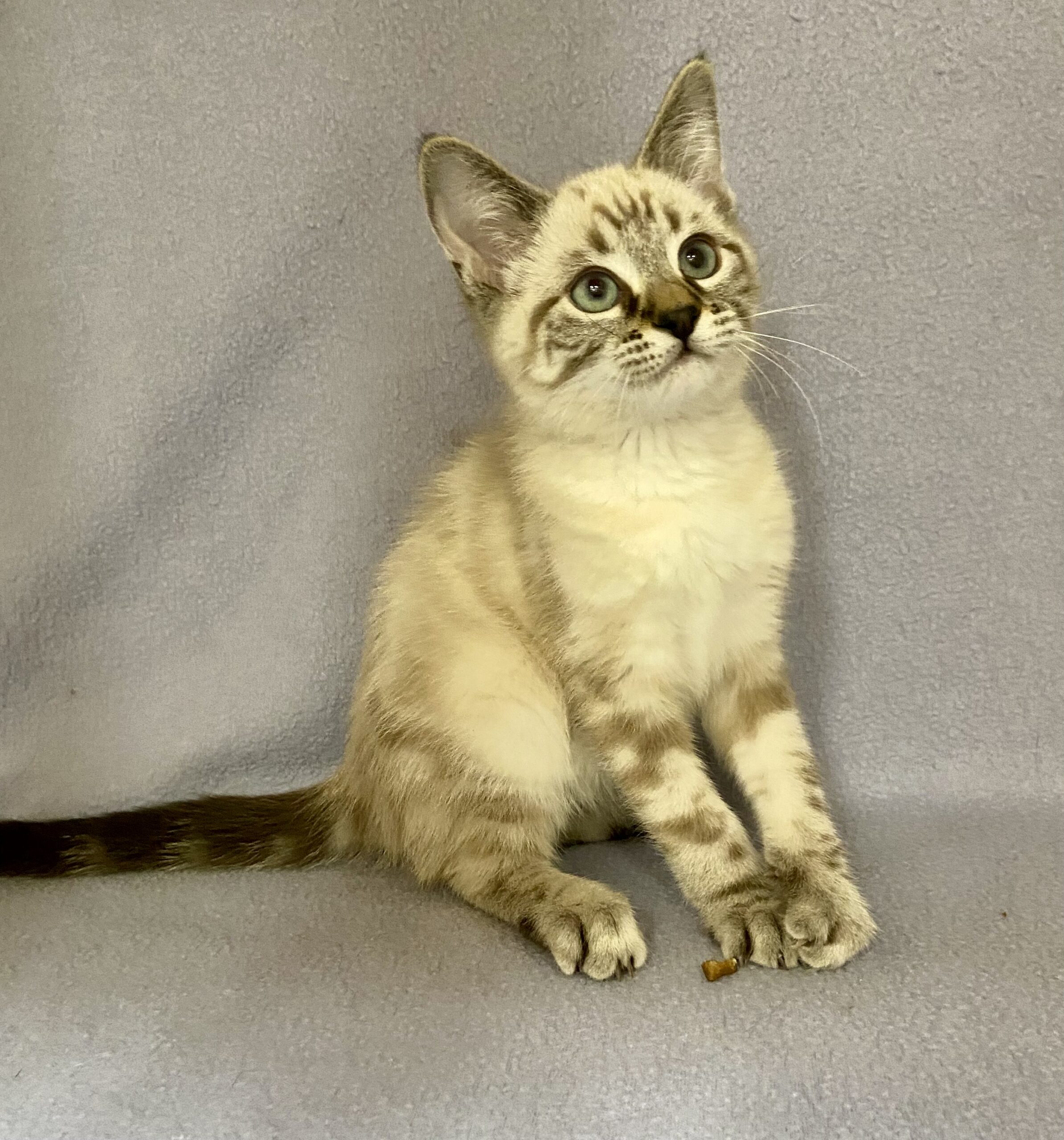 Hi, I’m Finn — a 2-month-old Lynx Point Siamese mix with a soft spirit and a gentle heart. I’m the quiet one in my litter, the kind of kitten who likes to observe before diving in. New things can feel a little big and loud to me, but with a little patience and kindness, I’ll start to show you just how sweet and loving I really am.