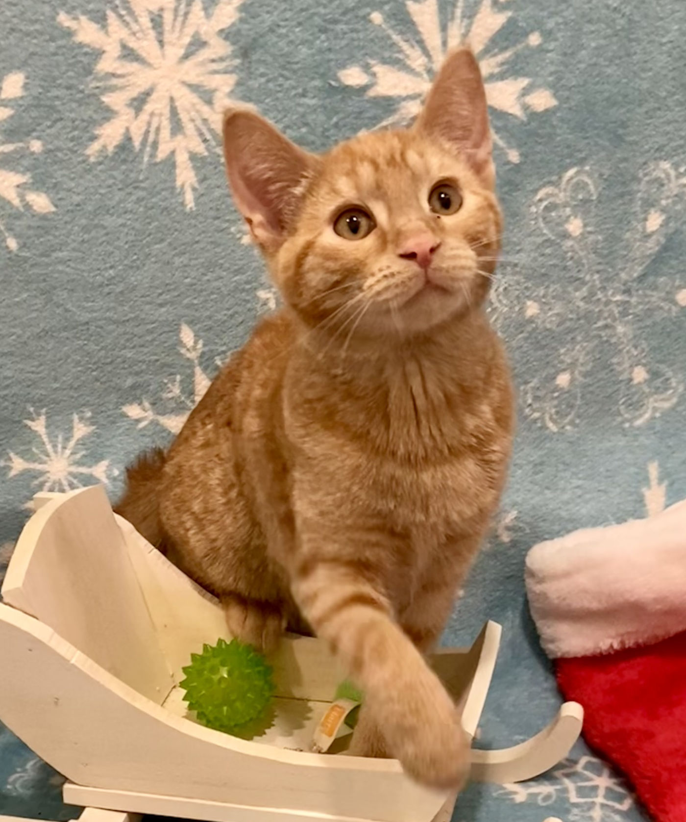 I am a light orange mackerel tabby with a gentle heart. I can be a little timid when I first meet new people, but once I feel safe my sweet personality shines through. I am playful, curious, and love discovering new things at my own pace. I promise that with a little patience, I will be a loving and loyal companion who brings soft purrs and quiet joy into your home.