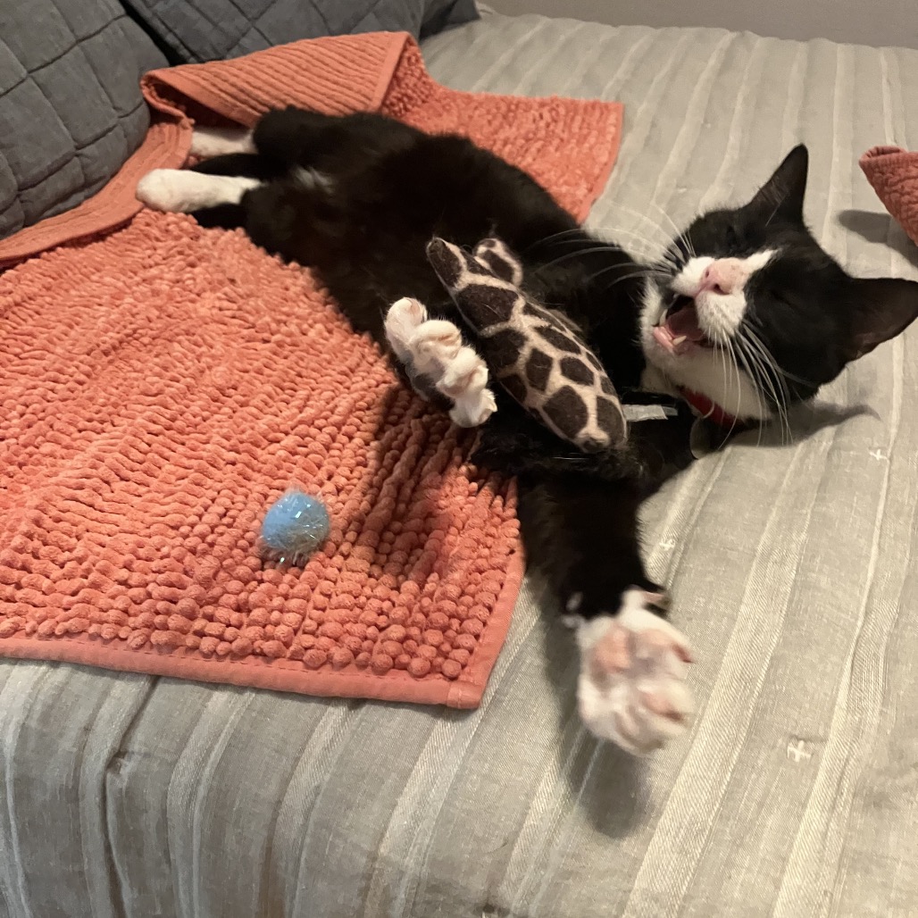 Playtime is one of my joys. I love small fluffy mouse or bird toys, especially when they are dipped in silver vine powder. Yeoow catnip bananas are a true favorite, and I never say no to Greenies treats in any flavor. I eat high fiber dry food and pate style wet food, and I have excellent litter box manners, especially with a nice high sided box.