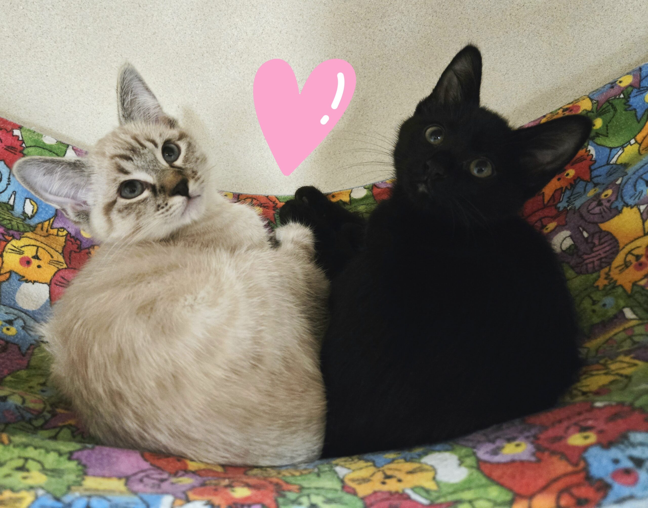 Hi there! We’re Jett and Finn, two 2-month-old brothers who balance each other purr-fectly. Jett’s a sleek little black panther with boundless energy and a playful heart, while Finn’s a gentle Lynx Point Siamese mix who brings calm and sweetness wherever he goes. Together, we make the best team — one full of fun, affection, and love.