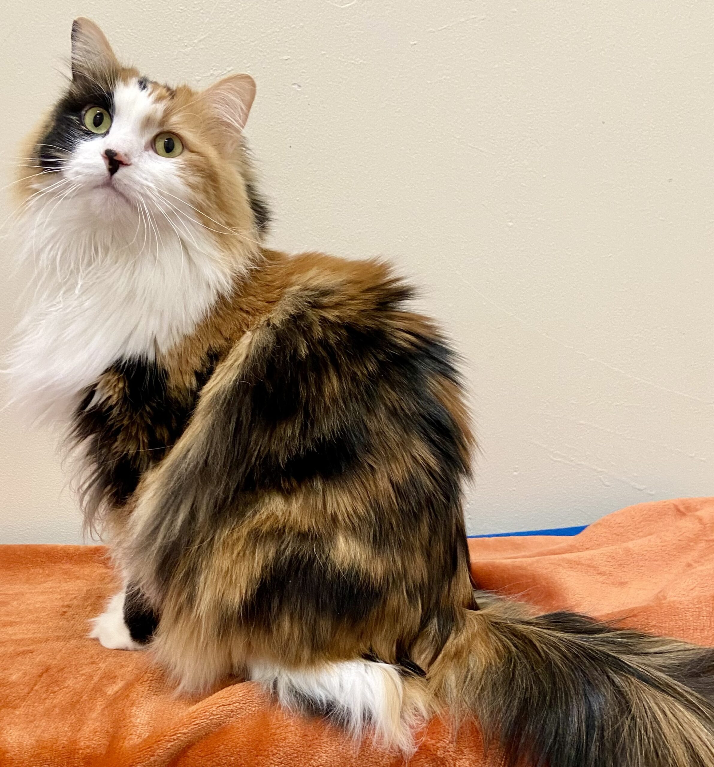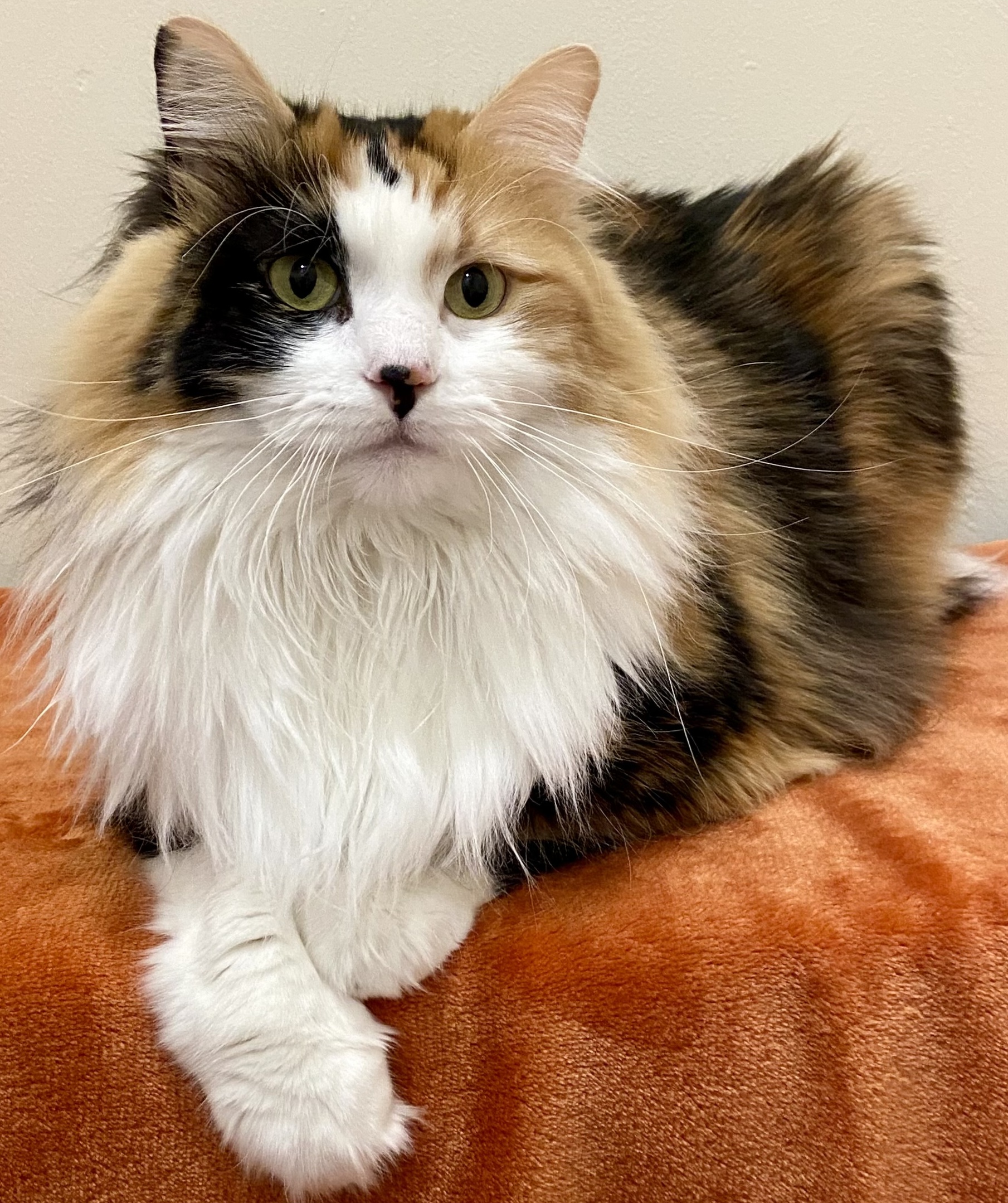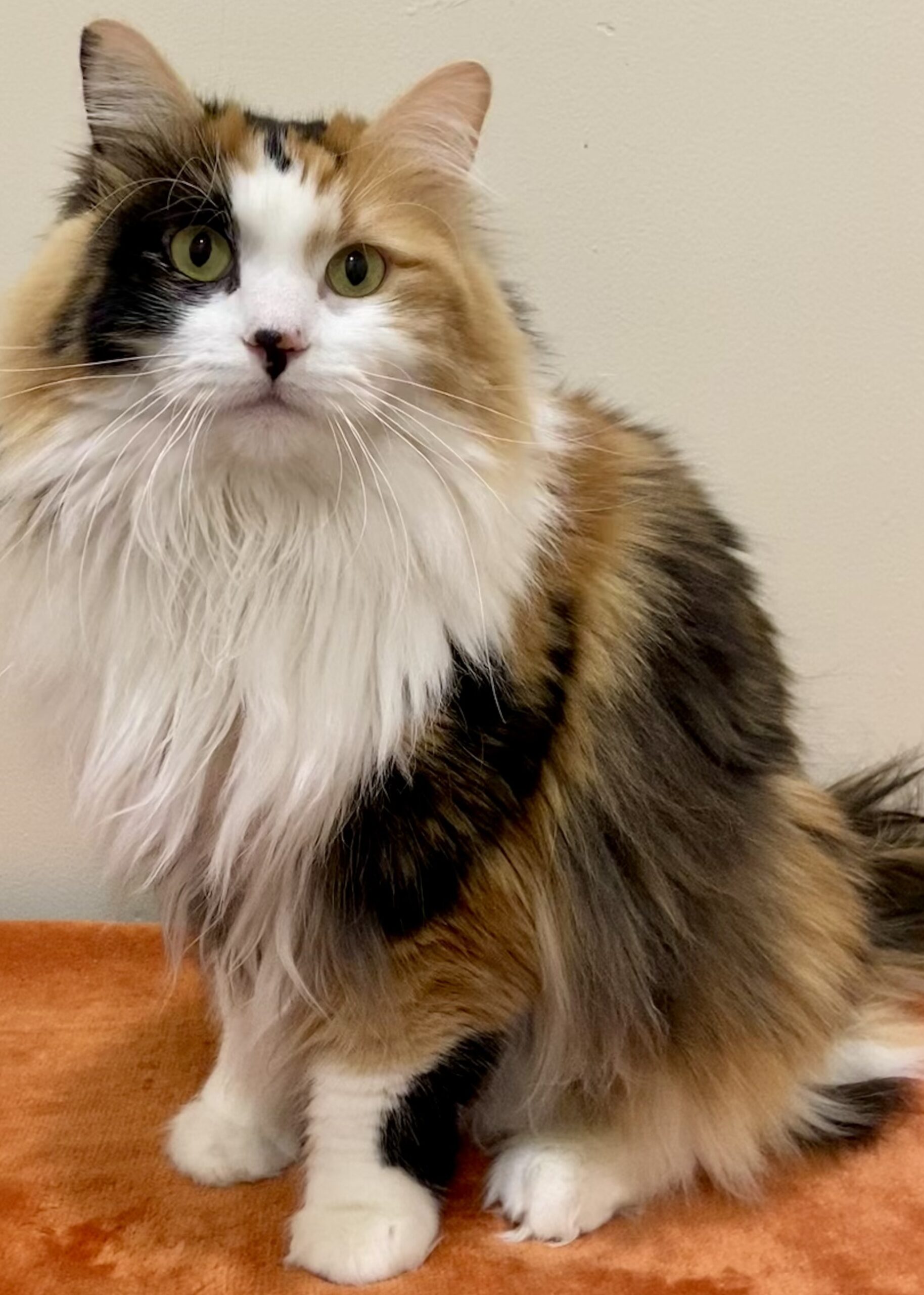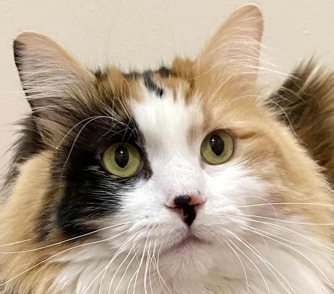 I’m a 2 year old domestic longhair calico, and yes, I am as gorgeous as everyone says. I was rescued from outside with my mom, and I have blossomed into a confident, affectionate girl who knows exactly what she likes.