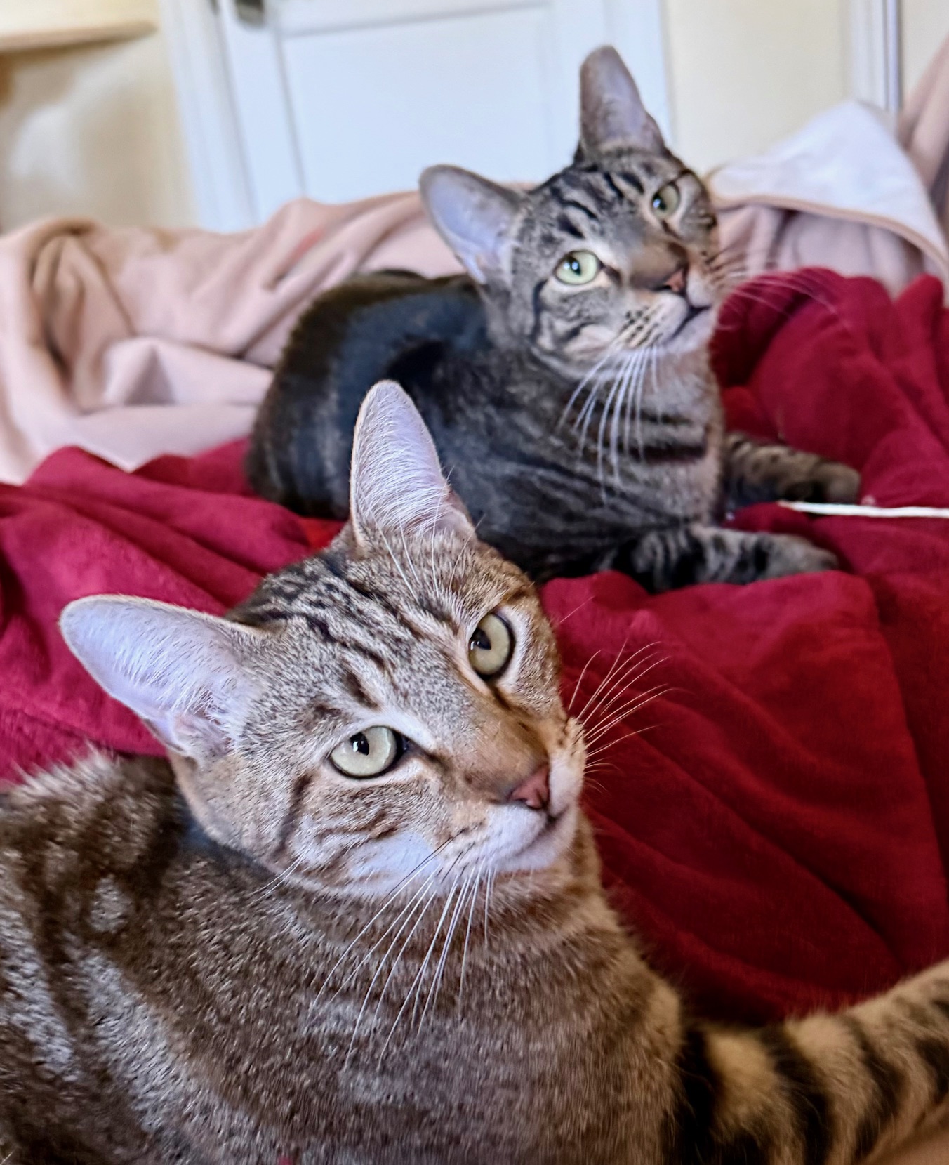 We have lived with other cats before but we’d do just fine as the only cats at home. And we’ll give you all the love and attention you’ll need. We haven’t lived with dogs or young children. Our foster mom thinks we wouldn’t like dogs, and we agree!