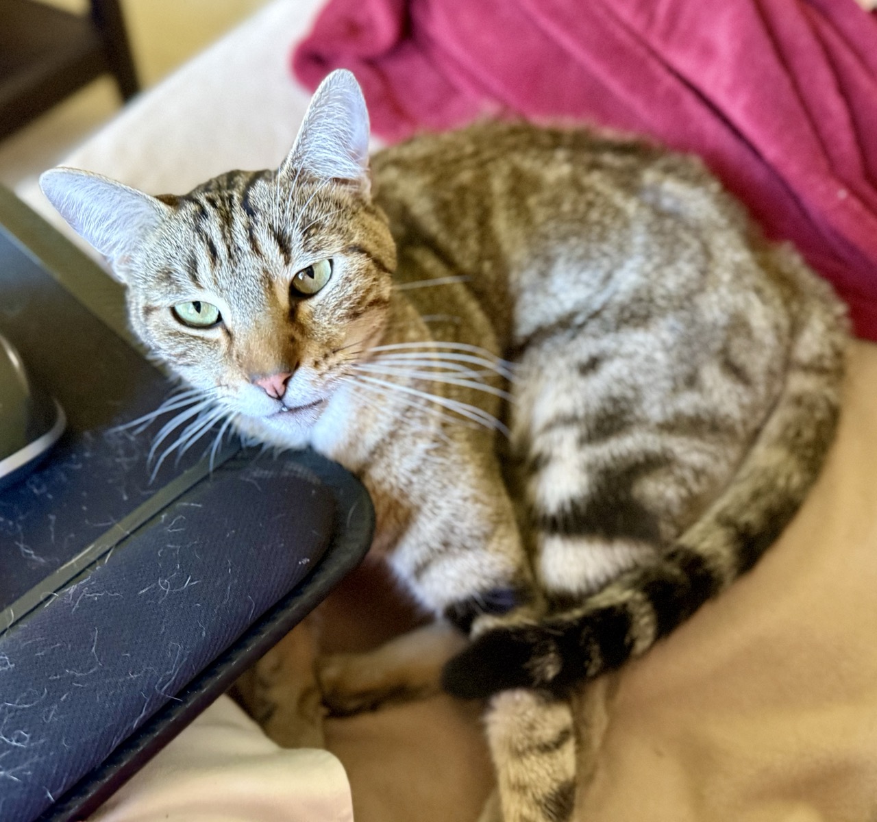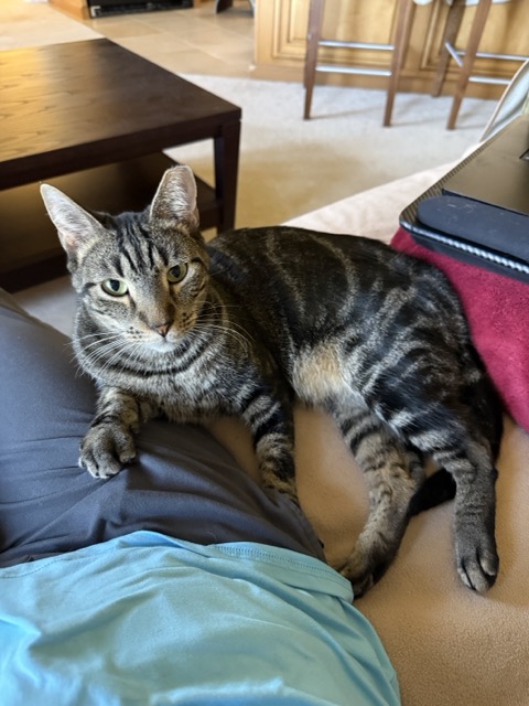I’m Kirk, a 3 year old black and brown tabby. I love to play, climb and explore (is that an open closet door…?), and wrestle with my little brother. I love being with my people too. I’m never far away so I don’t miss out on my head rubs. I’m not wild about strangers but you’ll always find me near you, next to you, or on your laptop.