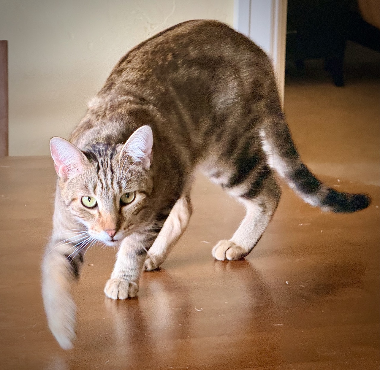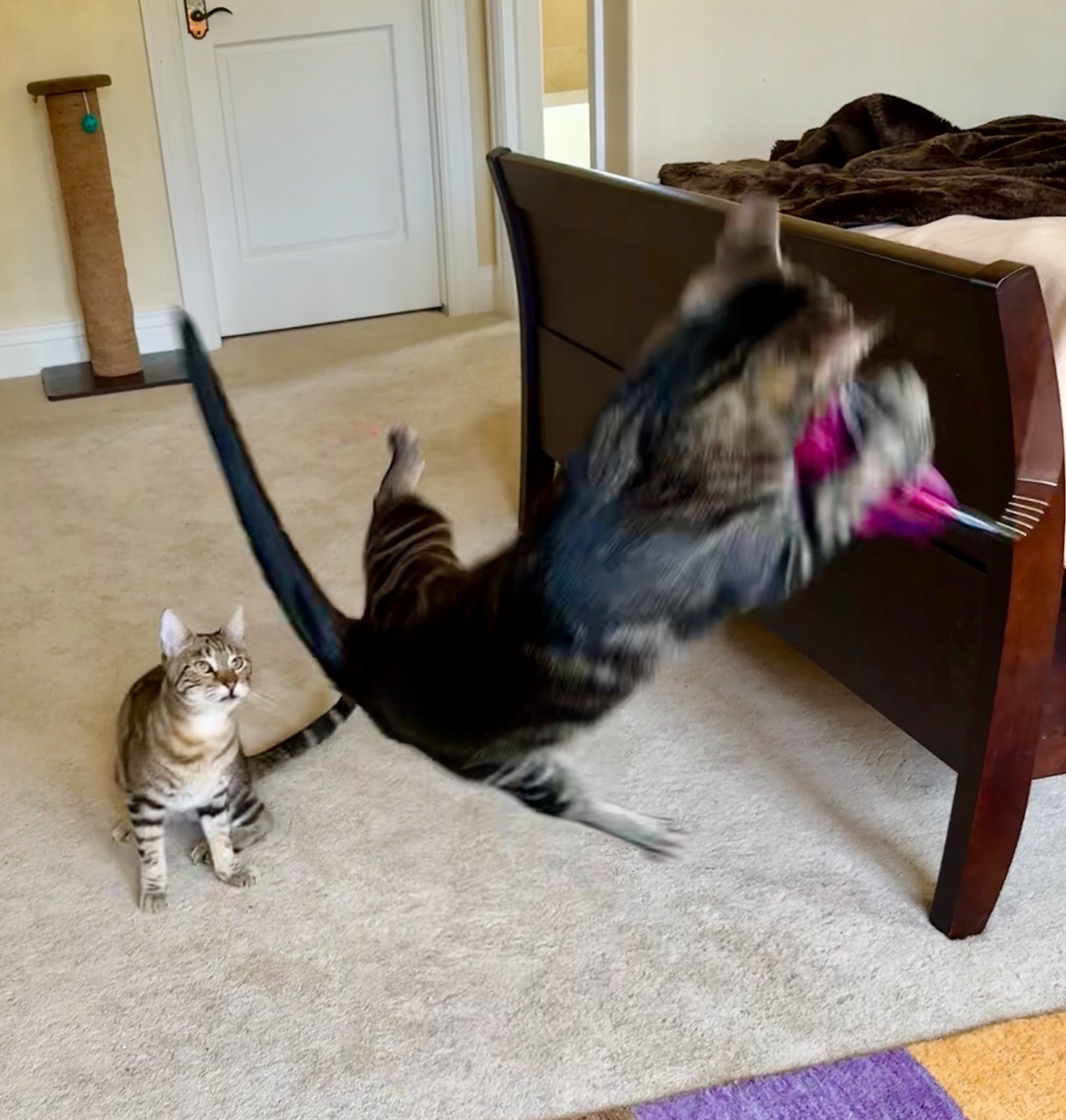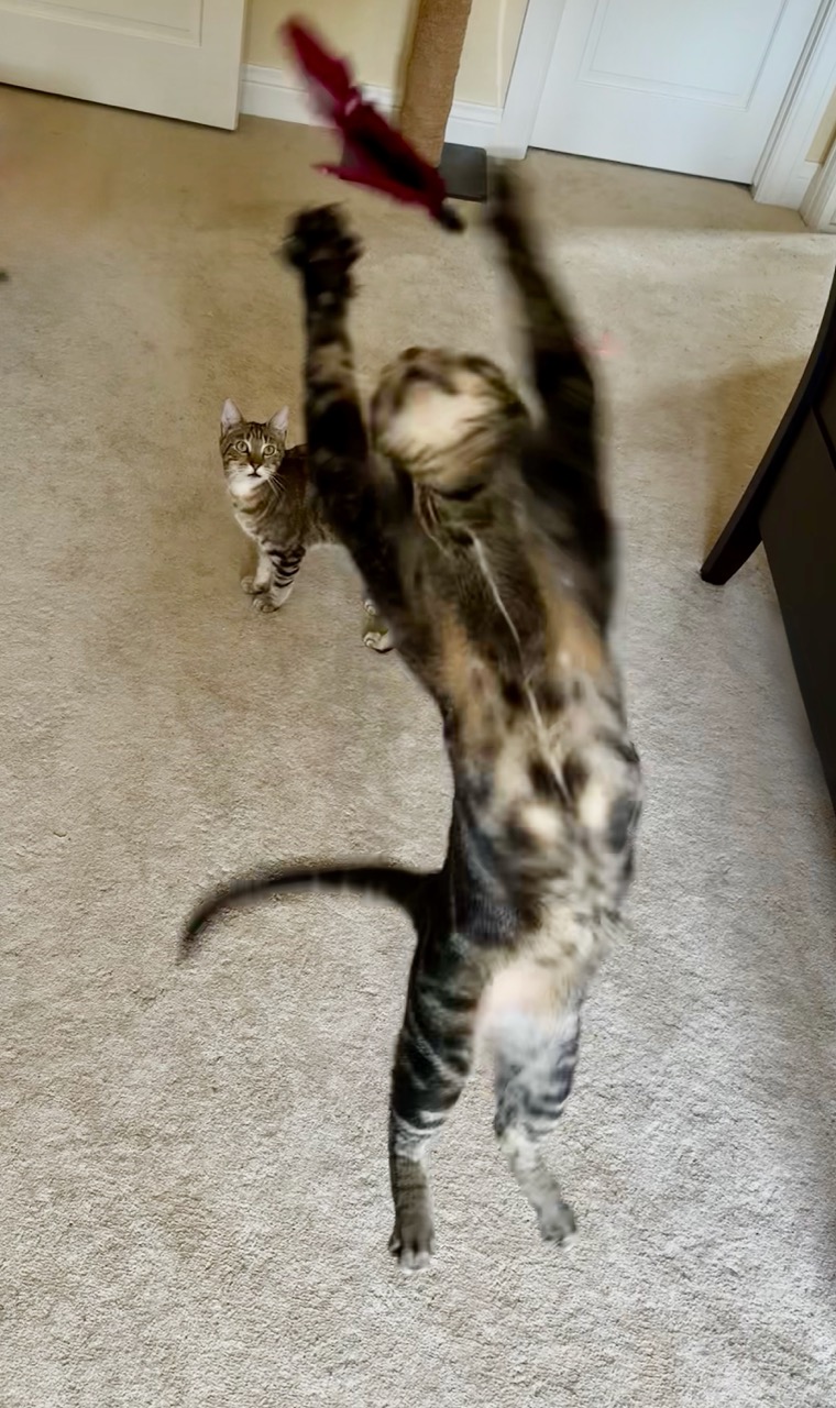 I’m Tyson, a one and half year old brown and gold tabby. I’m a bit shyer than my big brother Kirk but then again I’ve got the looks! I follow Kirk’s lead, so I am always nearby and looking for love. My foster mom thinks I’ll be a snuggle bunny when I get older but right now I am too busy having fun. I may not get as much air as Kirk but I still love to play.