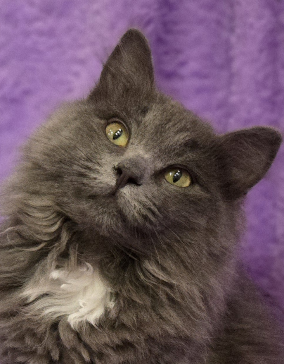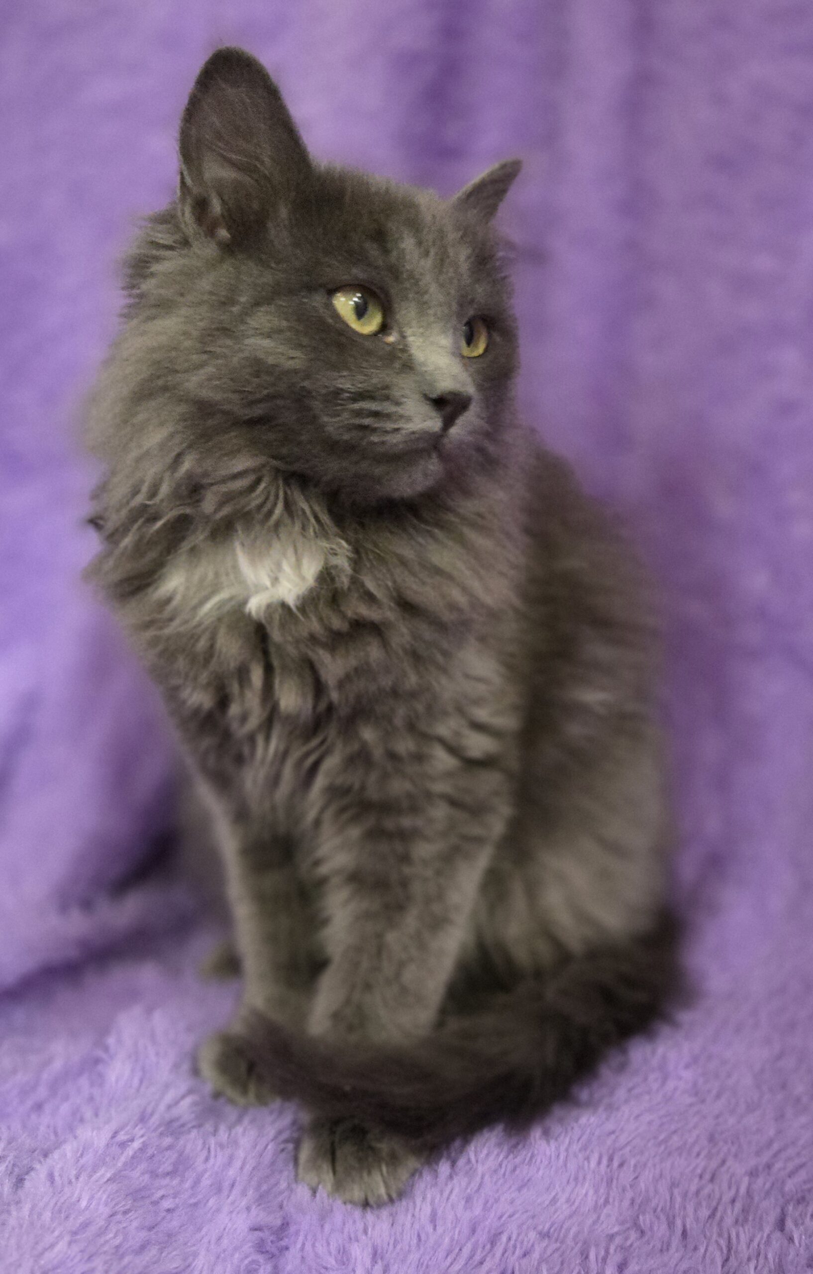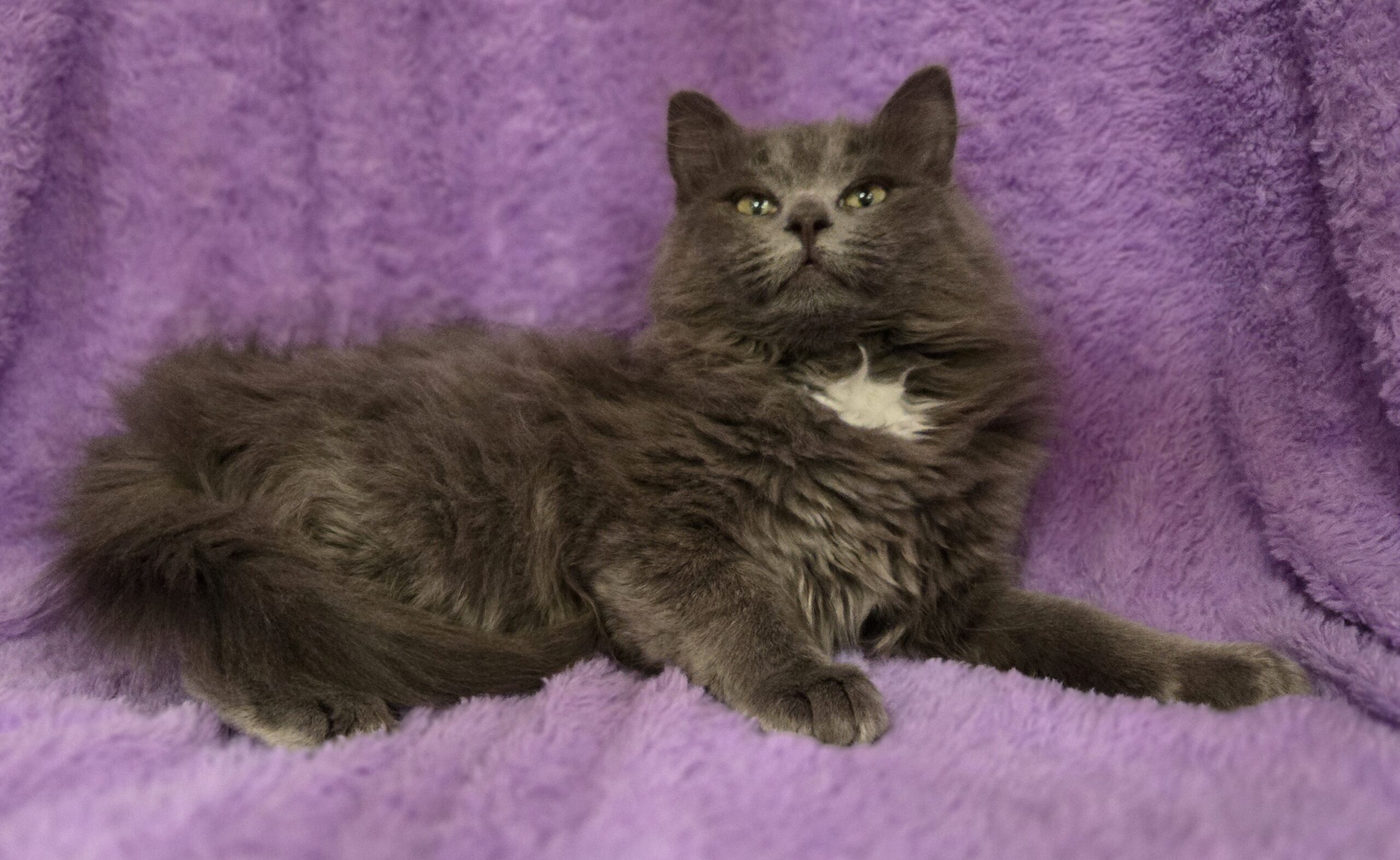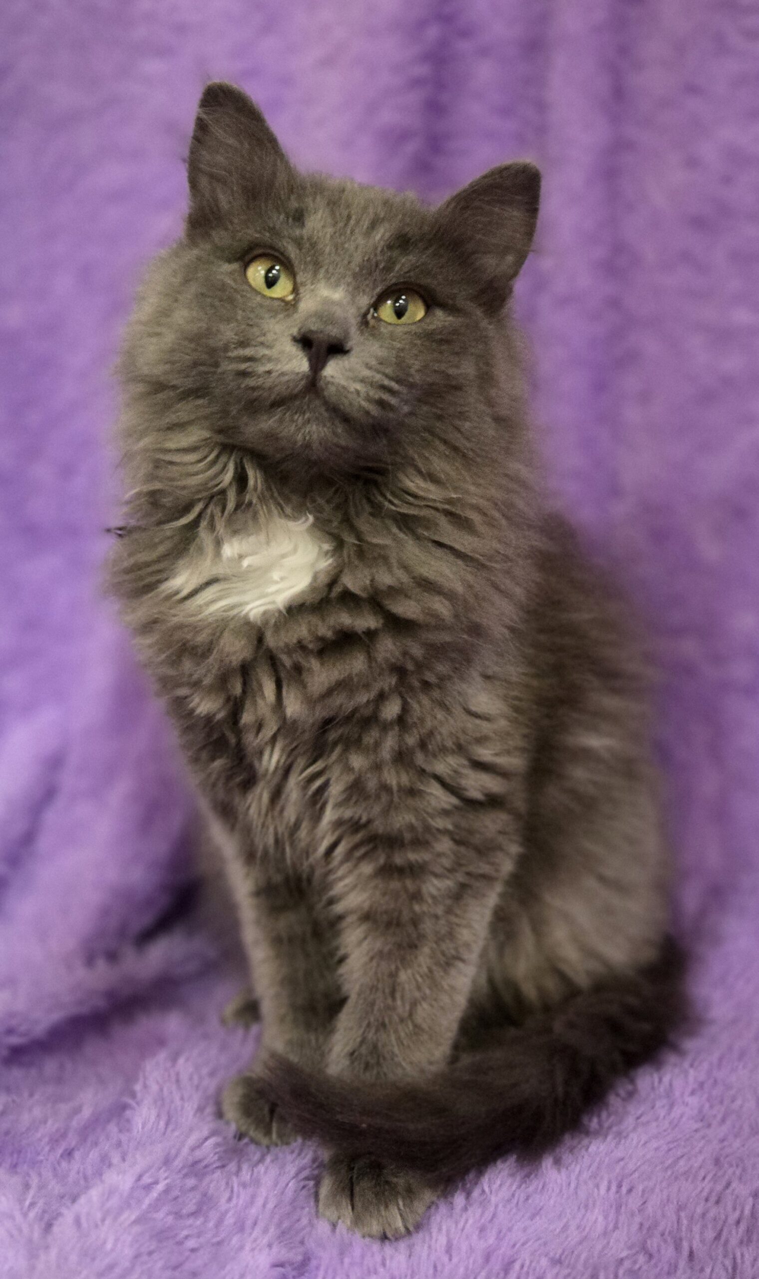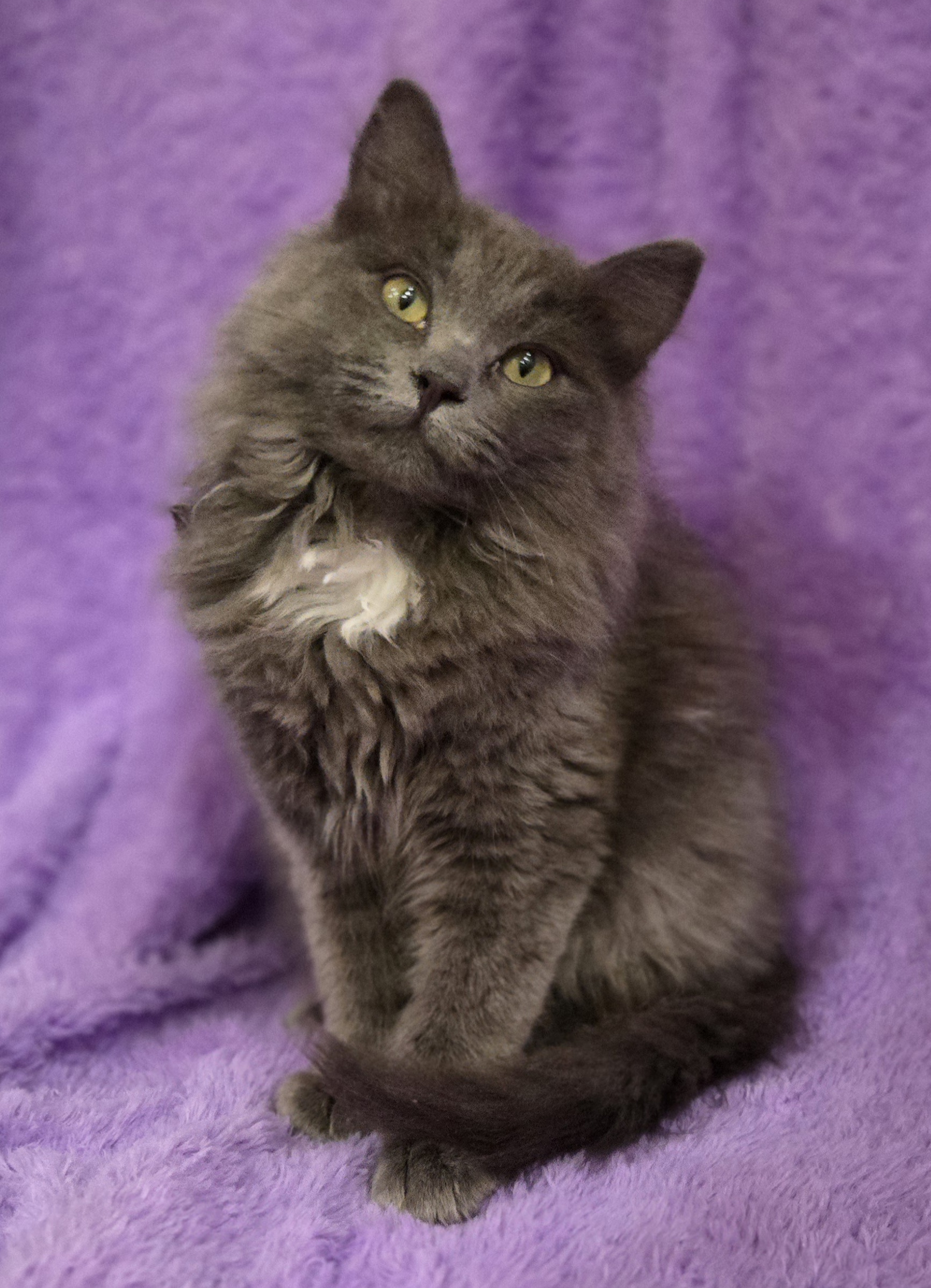 Hi, I’m Mochi. I’m a 4 month old kitten with the softest gray long fur and a little pearl splash of white on my chest. I’m often described as the most relaxed of my litter, and I think that fits me pretty well.