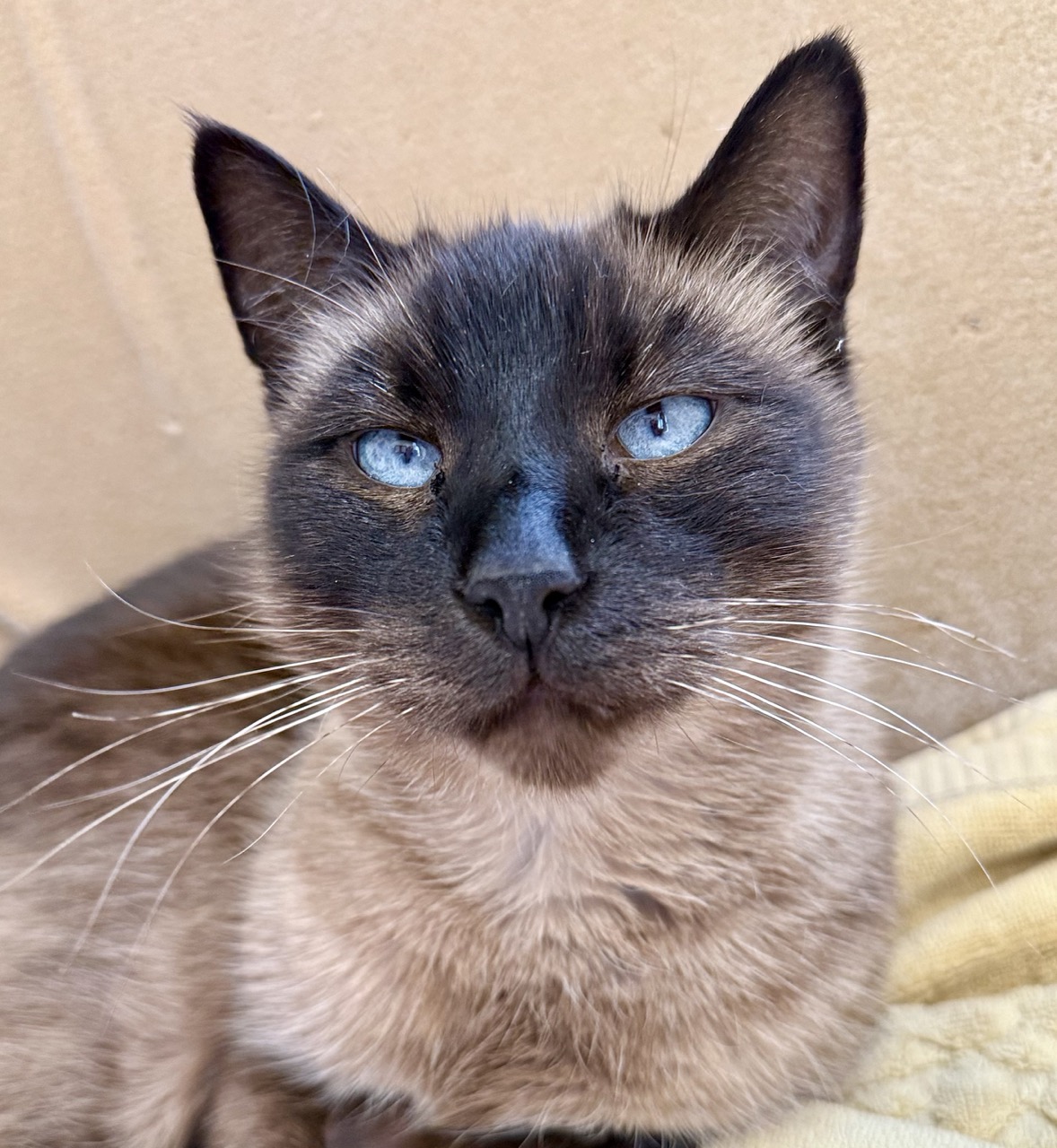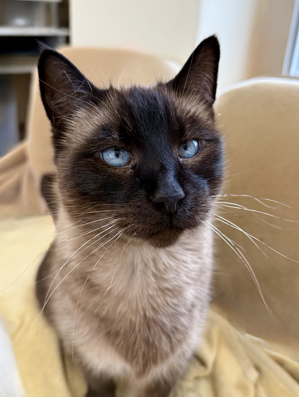 I may look like a Siamese, but the folks at Happy Cats Haven think I could be a seal-solid Tonkinese. Either way, I’m one-of-a-kind—and I wear it well.
