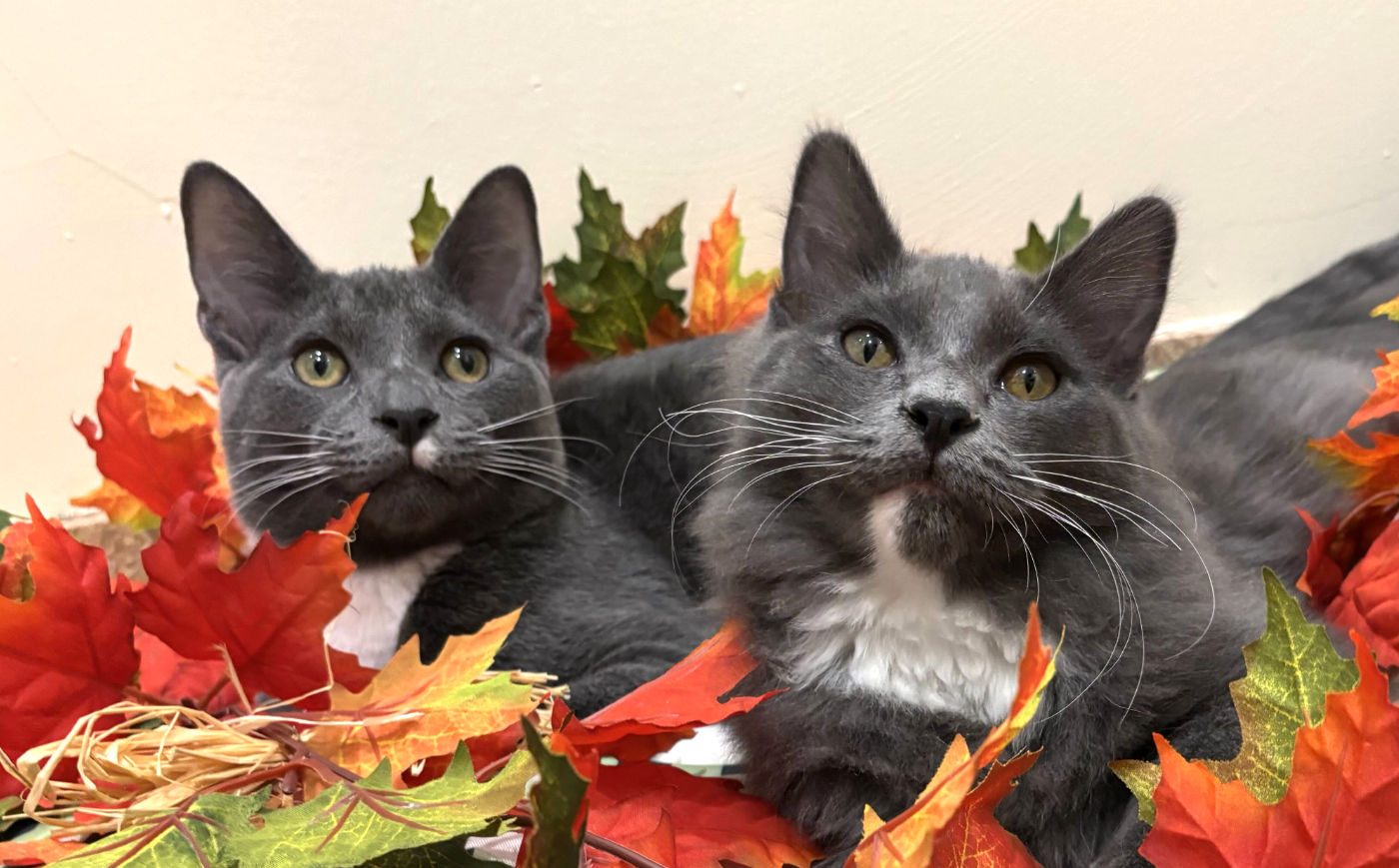 We are a 4-month-old tuxedo brother team with big personalities packed into our sleek grey suits. We have our own unique set of charms & skill. We’ll have you laughing as we chase balls across the room, pounce on wand toys, and make up our own games along the way.