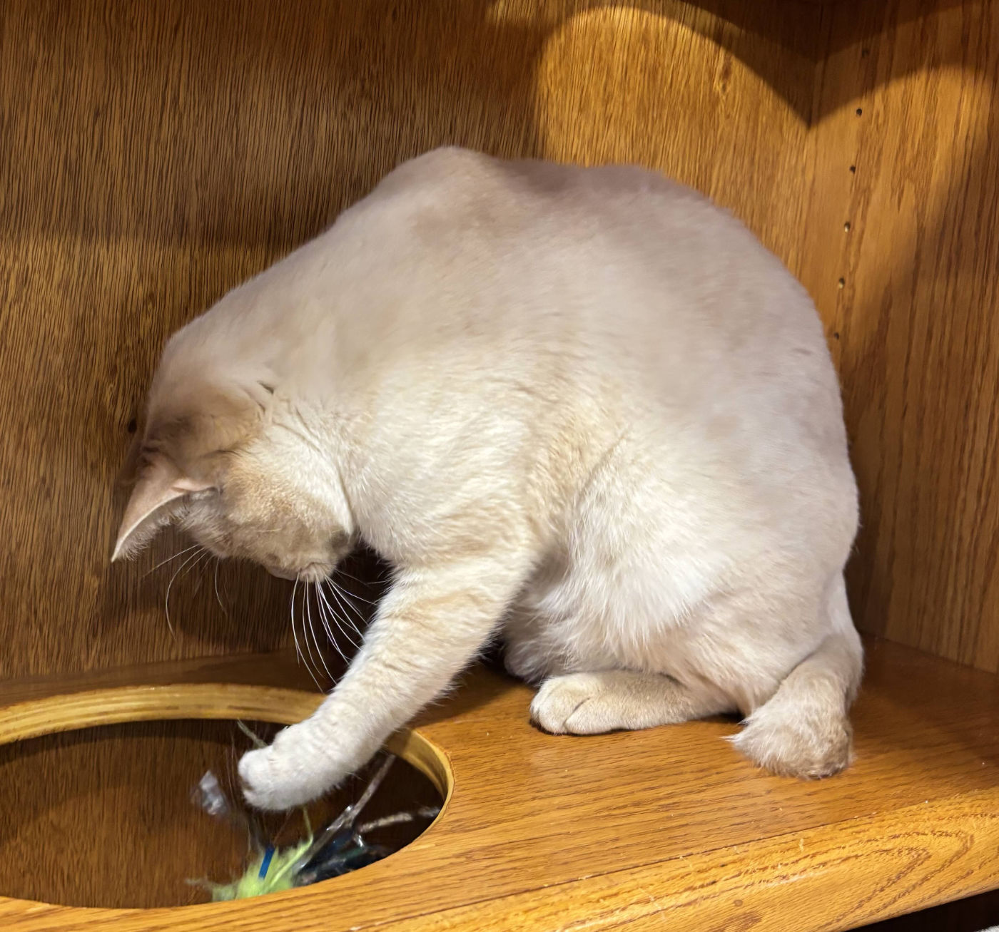 At only about a year old each, they’re still very much kittens when it comes to playtime! Get out those kitty wands and they’ll love to romp and pounce after them.
