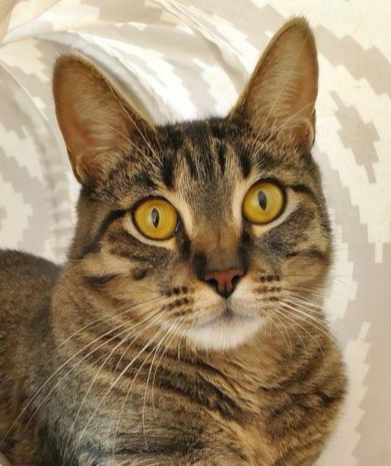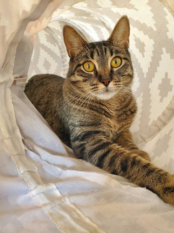 Hi there, I’m Sheva, a soft and stunning brown tabby girl with a playful heart and a whole lot of love to share. I am about 3 years old, but you would never know it from how kittenish I still am. I was surrendered to a sister rescue and then welcomed into the Happy Cats foster program, and now I am ready to find my forever people.