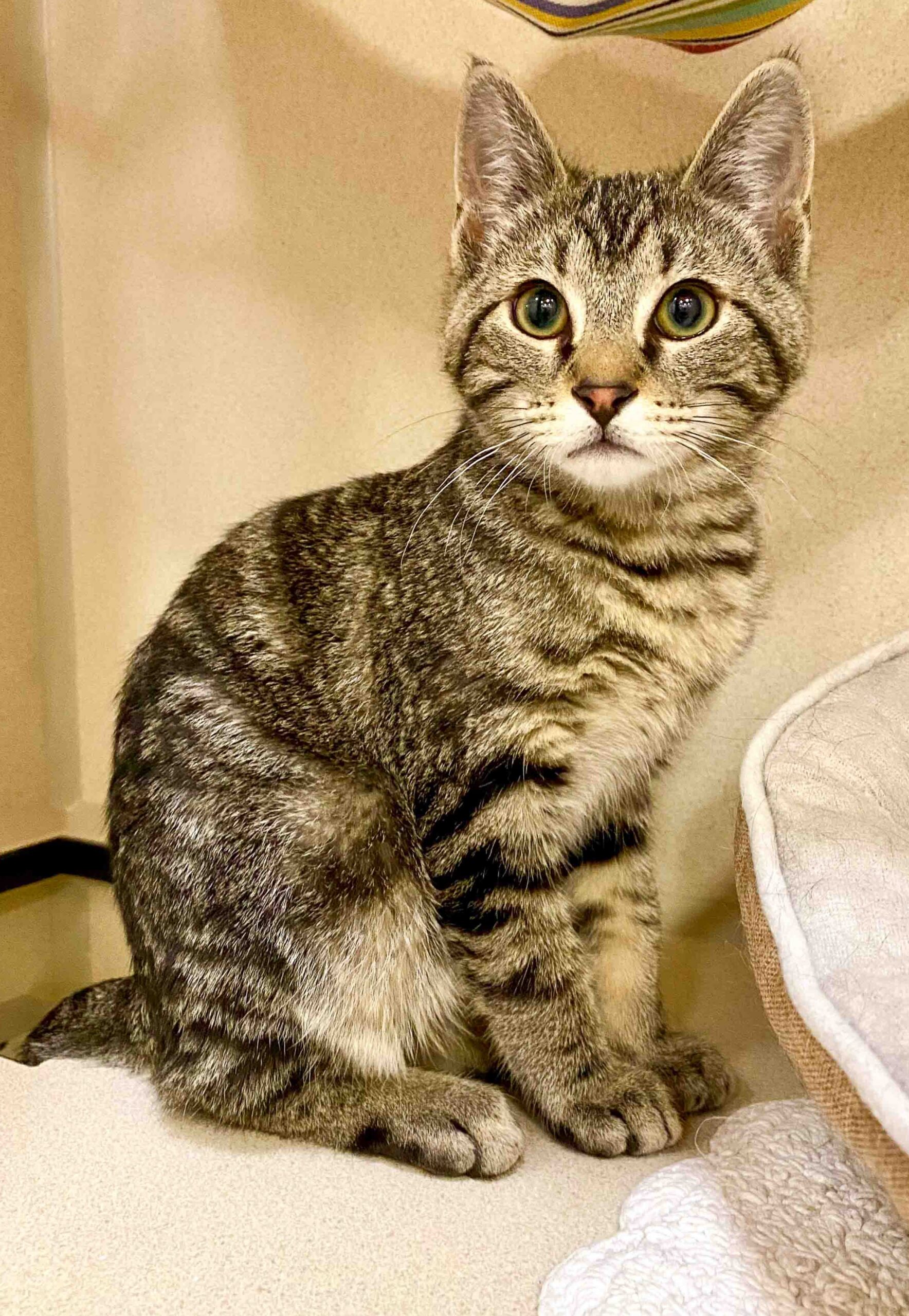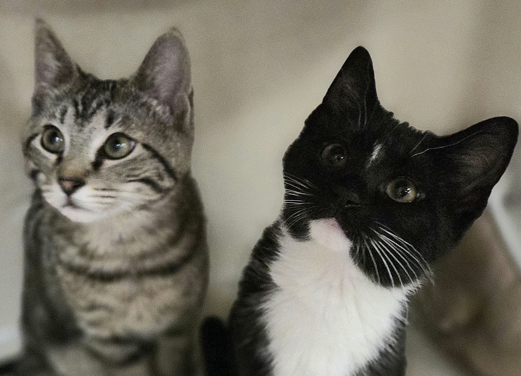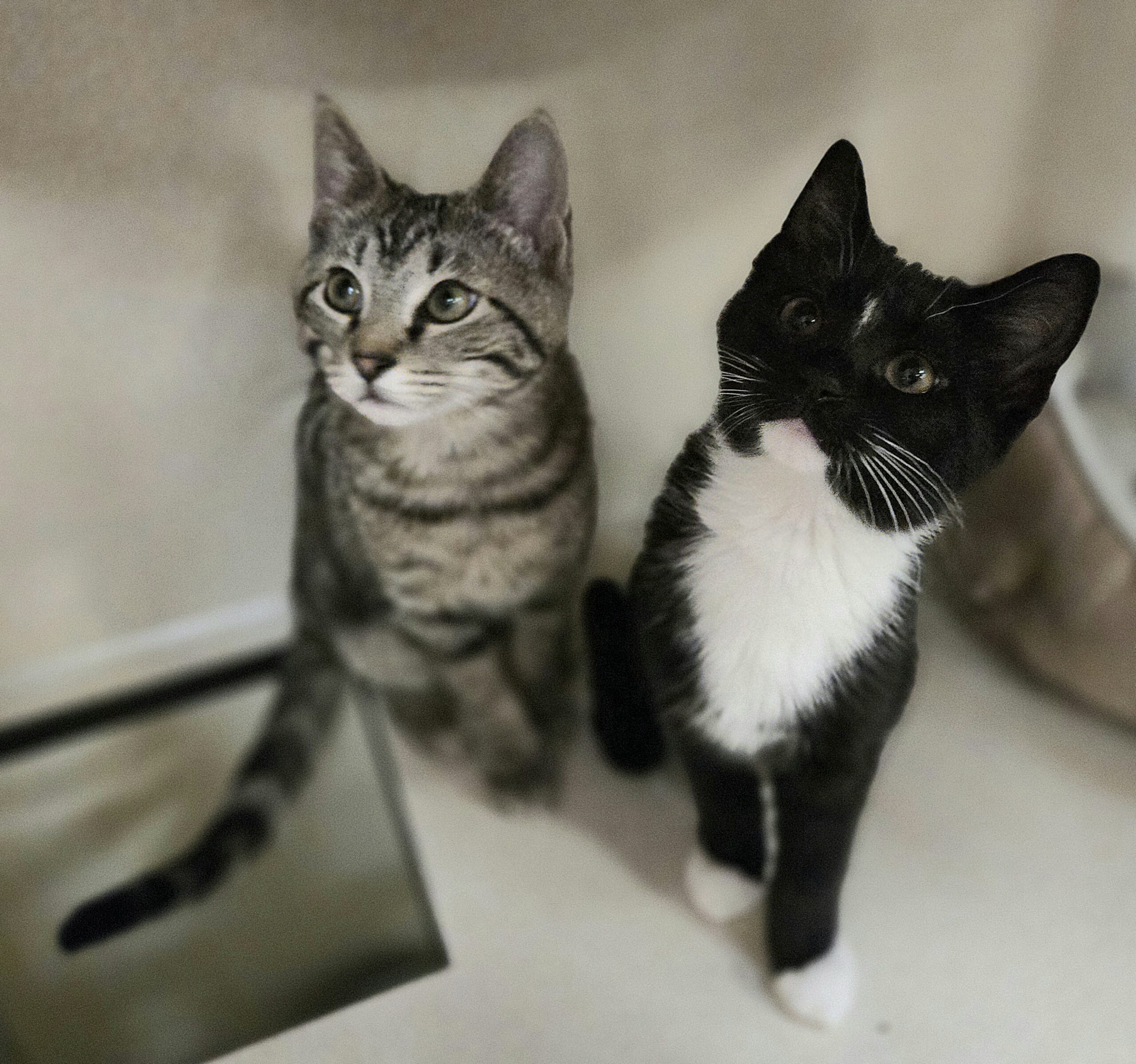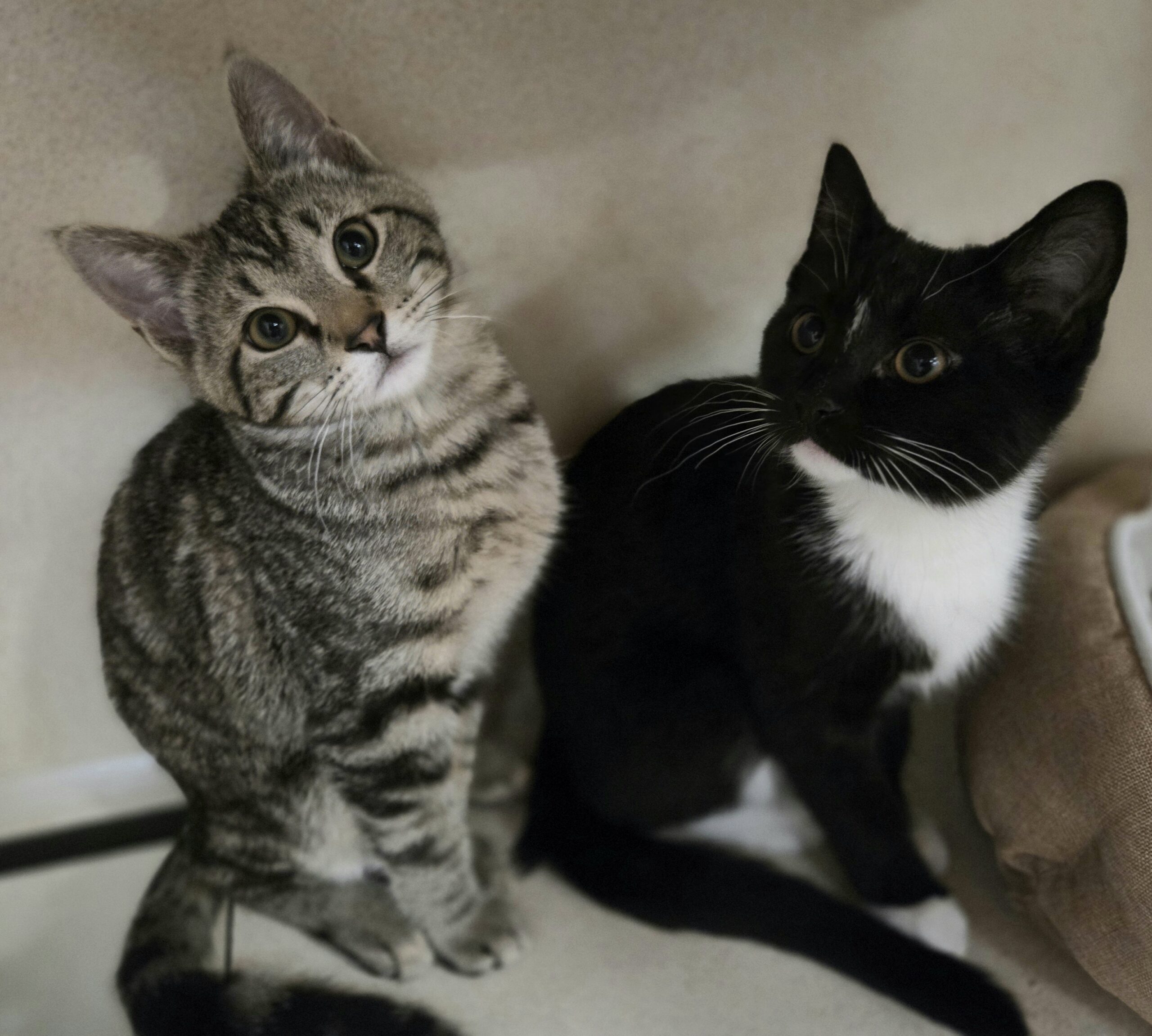 We’re a bonded pair of 3-month-old kittens who were found outside on our own, and ever since then, we’ve stuck close together. We’re looking for a home where we can continue growing up side by side, because we’re happiest as a team.