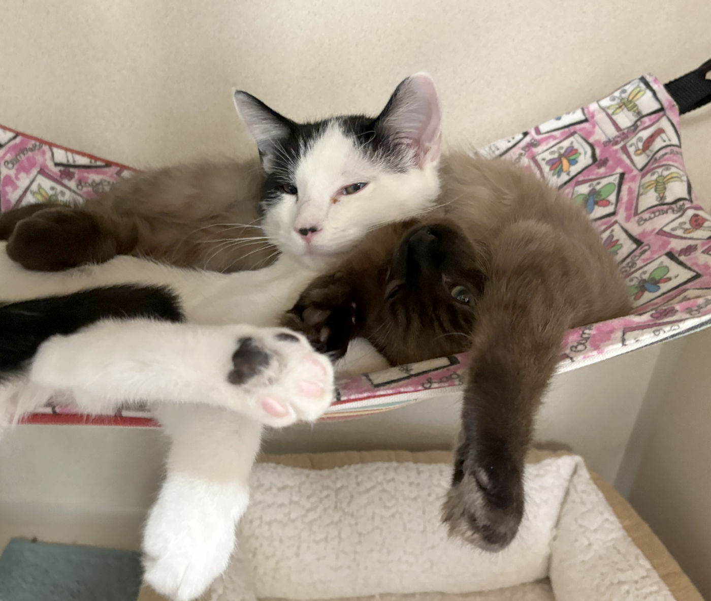 They can be adopted for $350 which includes their spay & neuter, vaccinations, microchips, a food and litter starter kit each, and a free well-kitty checkup each to help you get started.