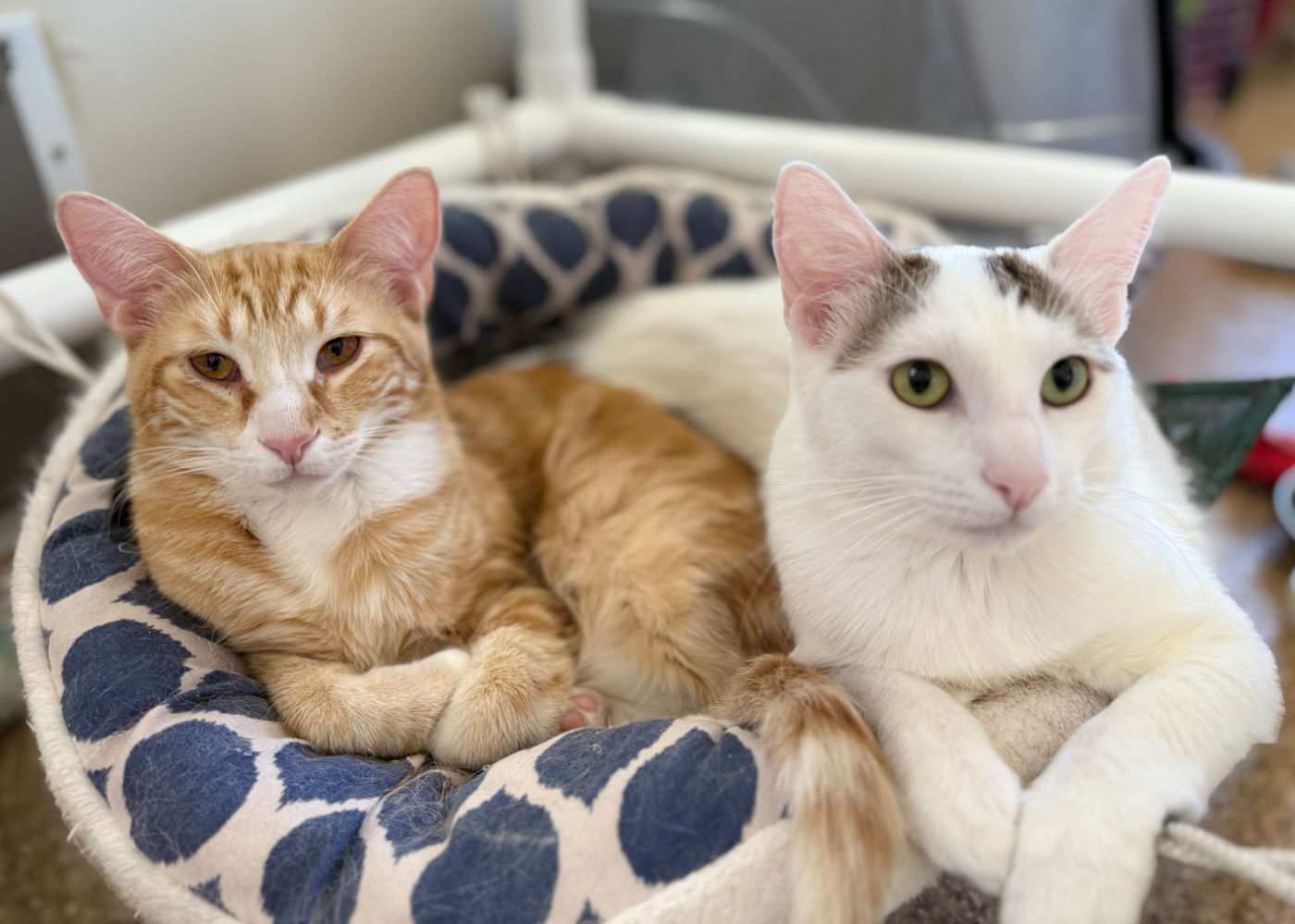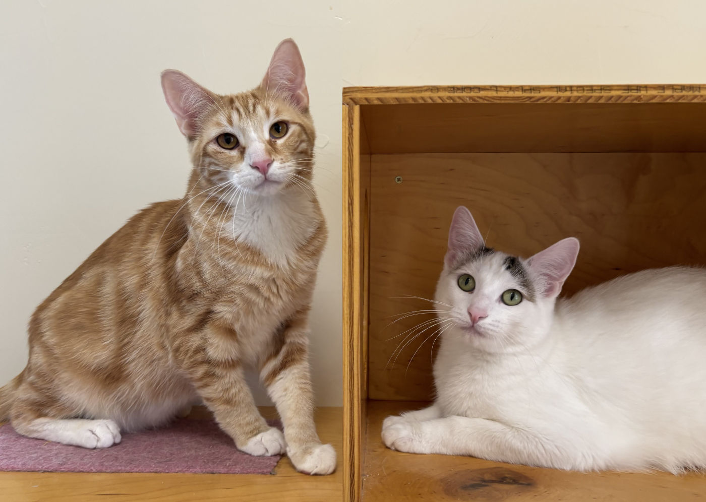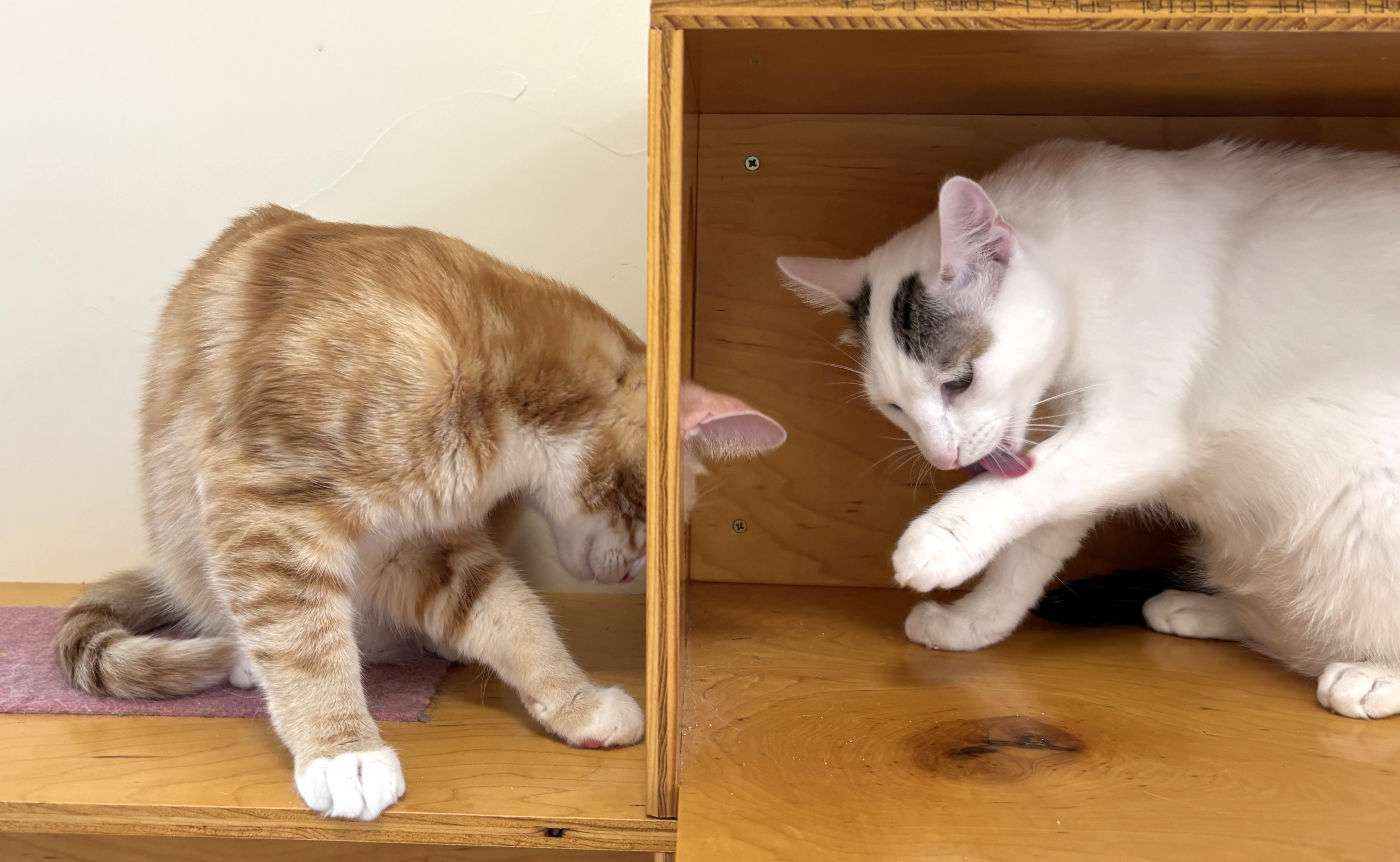Both are Say Please cats, which means you’ll be their hero if you can go slowly, quietly and let them tell you when to move forward or pull back especially when getting to know them. Bonus: They love it when they can choose to pet you!