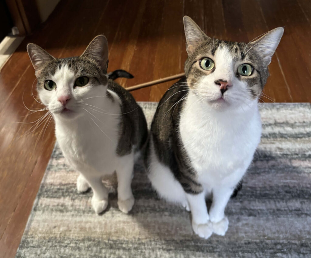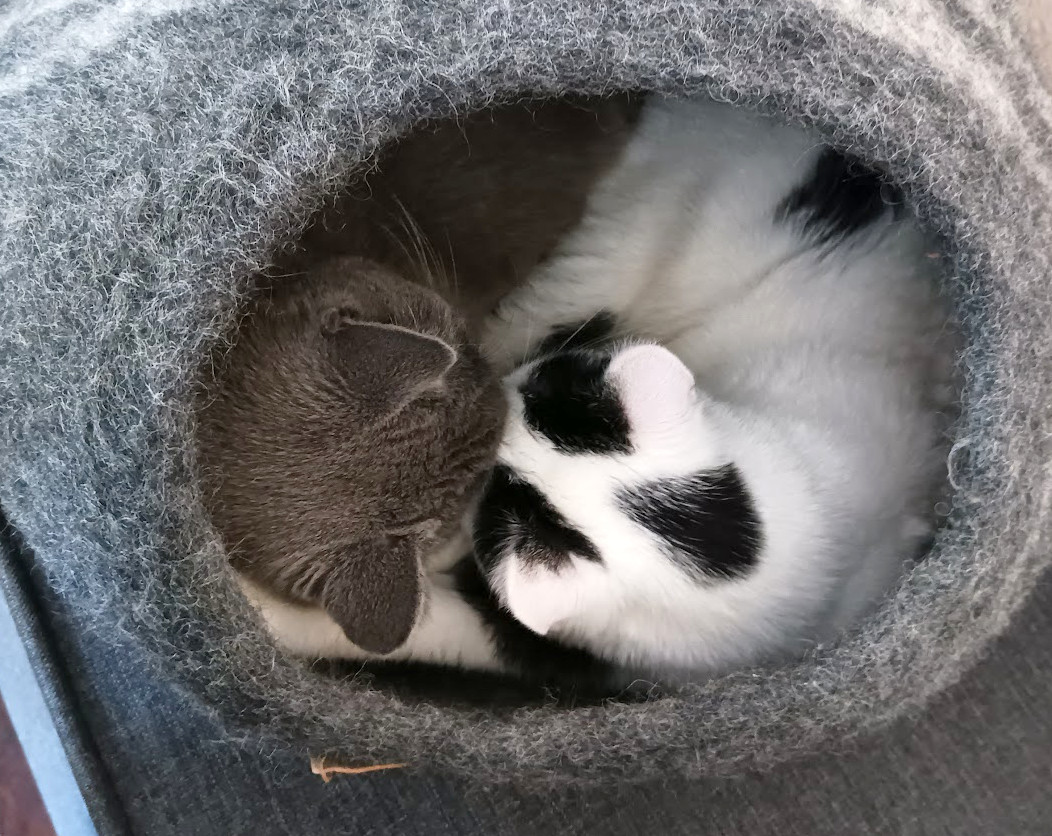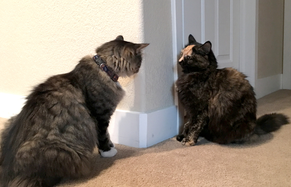Think noses first, then eyes: start with scent switching, then gradually reveal the cats to each other with a covered baby gate or at least by cracking the door. When you bring in a new cat, you’ve just halved your cat’s territory, which includes food, litter boxes, nests, toys…and most importantly, you! That means you have to double everything before you bring in a new friend, including your commitment to hanging out and playing with all your cats.